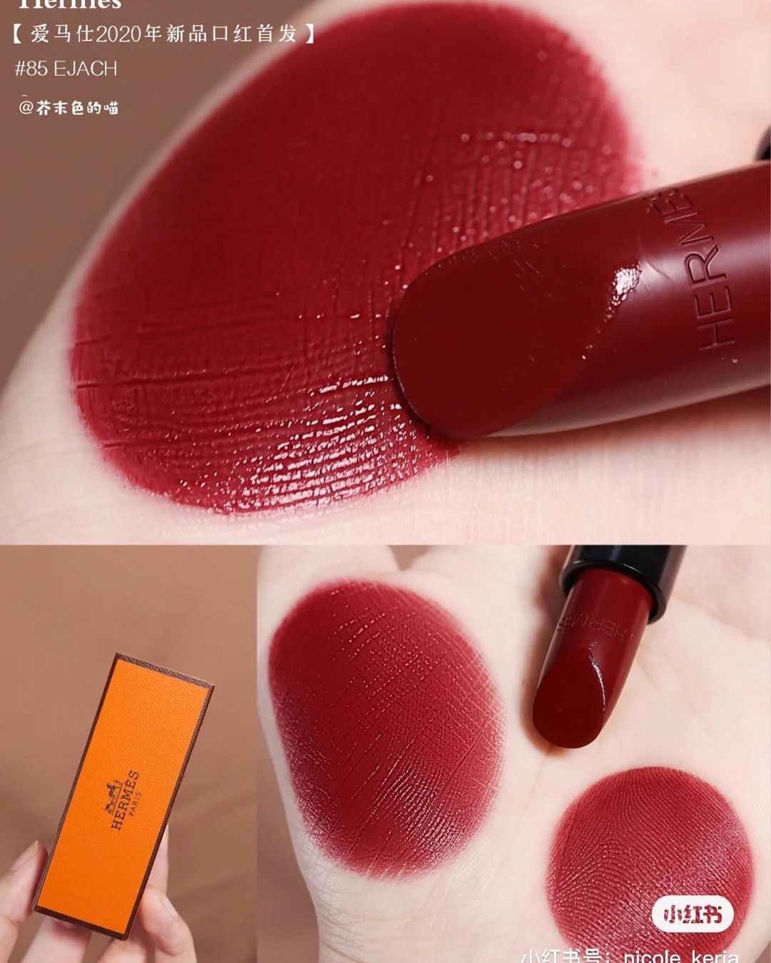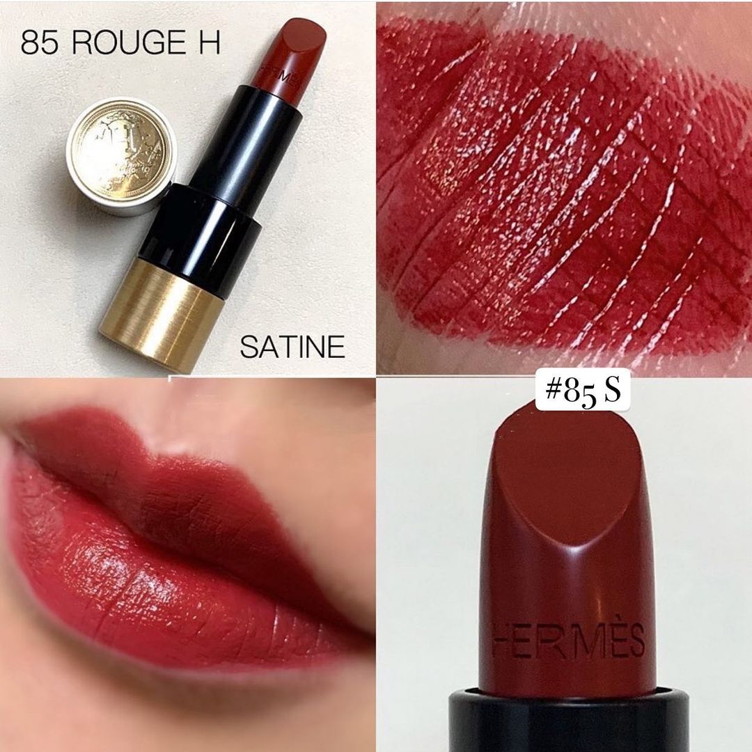 Trong BST son của Hermès thì cây 85 Rouge H là màu son dễ dùng bậc nhất. "Em nó" mang sắc đỏ thẫm (thiên về đỏ rượu và có chút nâu) nên vô cùng quyến rũ và sang chảnh, rất hợp để diện đến những buổi tiệc tối. Cây son này hợp với hầu hết mọi tông da và tạo cảm giác da sáng, răng trắng hơn. Với chất son satin nhiều dưỡng, thỏi 85 Rouge H để lại làn môi cực kỳ mềm mại, mịn mướt và không để lộ vân môi kém xinh. Cũng không thể bỏ qua được vỏ ngoài phối màu color block vừa xinh tươi, vừa sang xịn đúng chất Hermès của cây son 85 Rouge H, chỉ cần cầm trên tay thôi cũng đã cho thấy sự sang trọng, thượng lưu của chủ nhân.