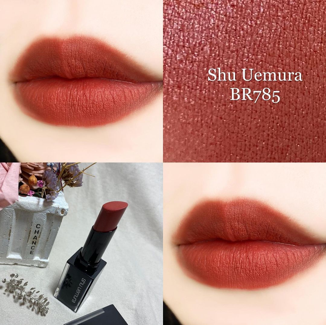 Đây là một trong những cây son bán chạy hàng đầu của dòng Rouge Unlimited Amplified Matte nhà Shu Uemura. Cũng phải thôi, rất khó để cưỡng lại sắc son đỏ nâu thiên hồng siêu xinh và trendy của em này. Tông màu vừa nhã vừa ngọt ngào của cây BR 785 không hề làm xỉn men răng và hợp với hầu hết mọi tông da. Chất son của sản phẩm mịn lì, lên môi khá mượt và không bị khô. Thêm nữa, mùi hương ngọt ngào của cây son cũng khiến người ta phải mê mẩn.