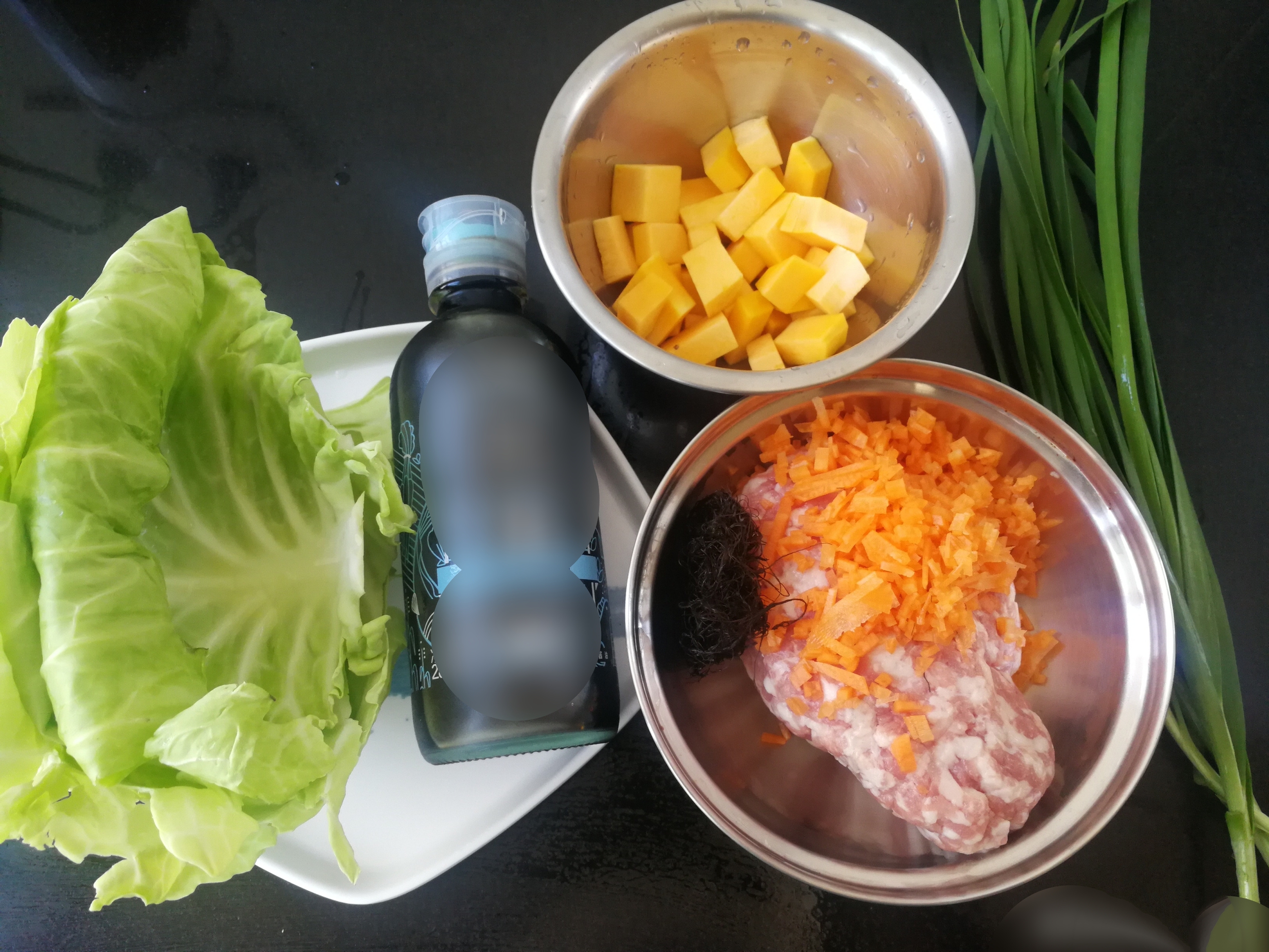 - 5 lá bắp cải, 150g thịt lợn băm, 10g rong biển khô (có thể bỏ qua hoặc thay bằng nguyên liệu khác), 50g cà rốt, 30g bí đỏ, 6 củ hành lá (để làm dây buộc), 3g tinh bột bắp.
