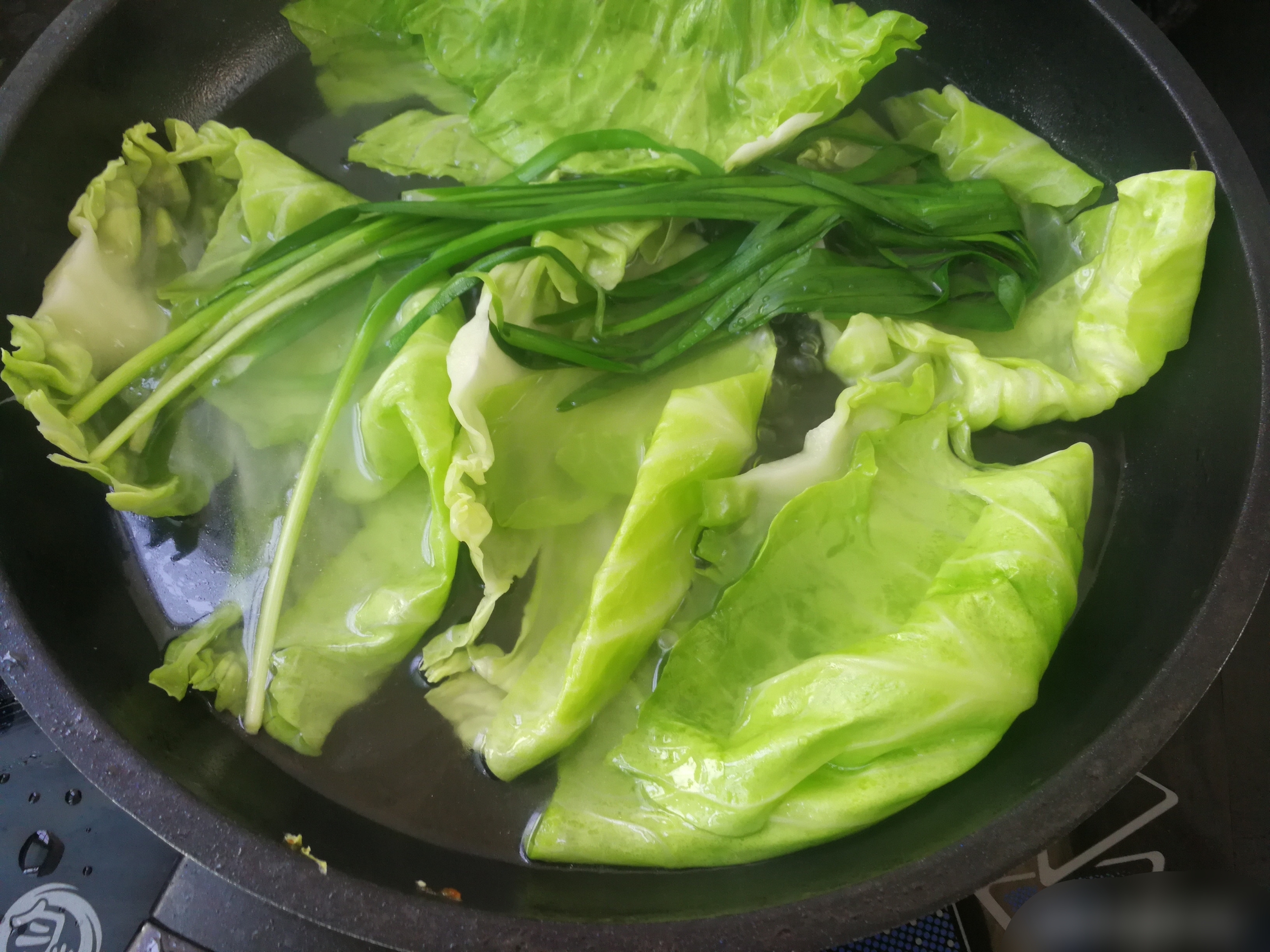 Bước 1: Đun sôi nước trong nồi, thêm xíu dầu ăn cùng muối vào. Sau đó, cho lá bắp cải và hành lá vào chần mềm. Riêng bắp cải chần mềm hơn, còn hành chần nhanh để giữ được độ dai của lá. Sau khi chuyển màu xanh đậm hơn thì vớt ra chậu nước đá rồi để riêng.