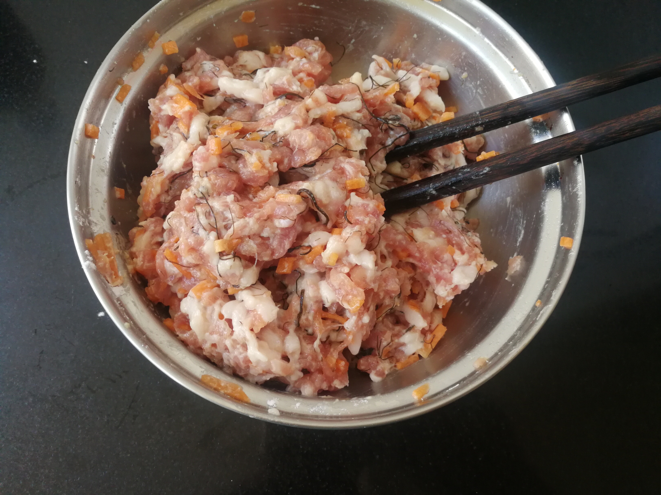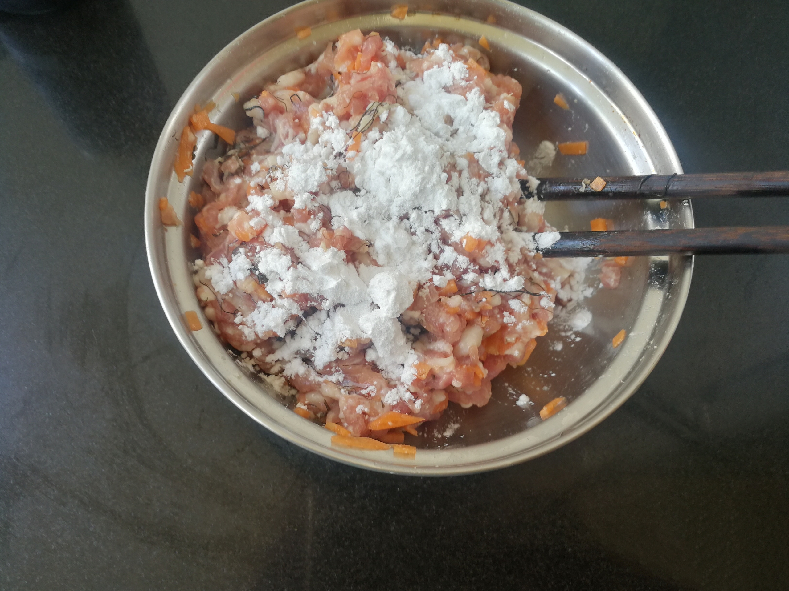 Bước 2: Cà rốt thái hạt lựu nhỏ hoặc băm nhỏ tùy ý. Thêm cà rốt, 1 thìa dầu hào, 1/2 thìa cà phê tiêu, 1/2 thìa cà phê đường, 1/2 thìa cà phê muối và 1 thìa nước tương vào thịt lợn băm. Trộn đều nguyên liệu. Thêm tinh bột bắp để phần nhân kết dính tốt hơn.