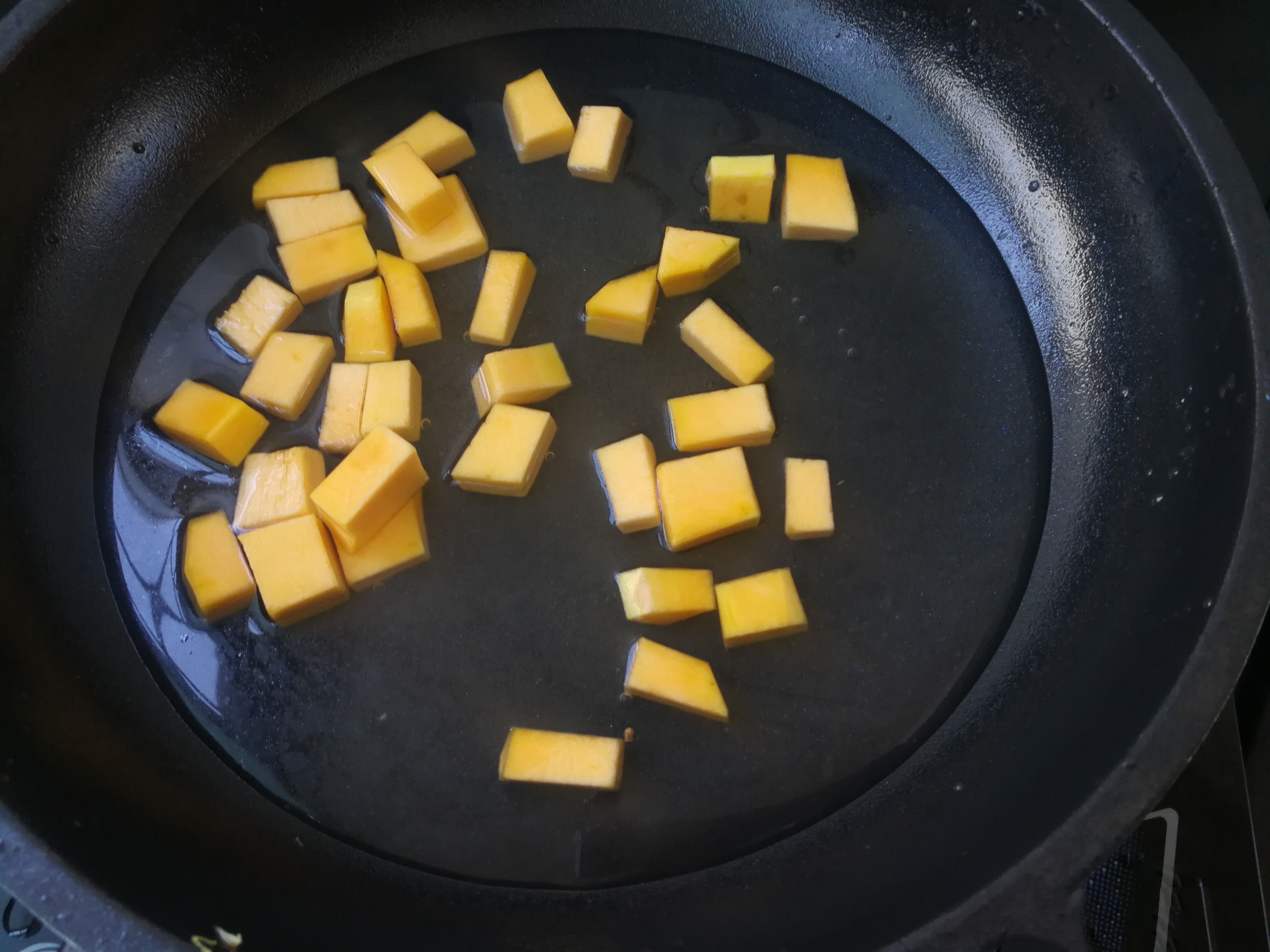 Bước 4: Bí đỏ thái hạt lựu. Cho chút nước vào nồi, thêm bí và xíu muối vào và đun sôi. Cho đến khi bí chín và nhuyễn tạo thành súp sền sệt. Sau khi đặt các túi bắp cải thịt lợn vào đĩa. Rưới phần súp bí đỏ này lên trên.