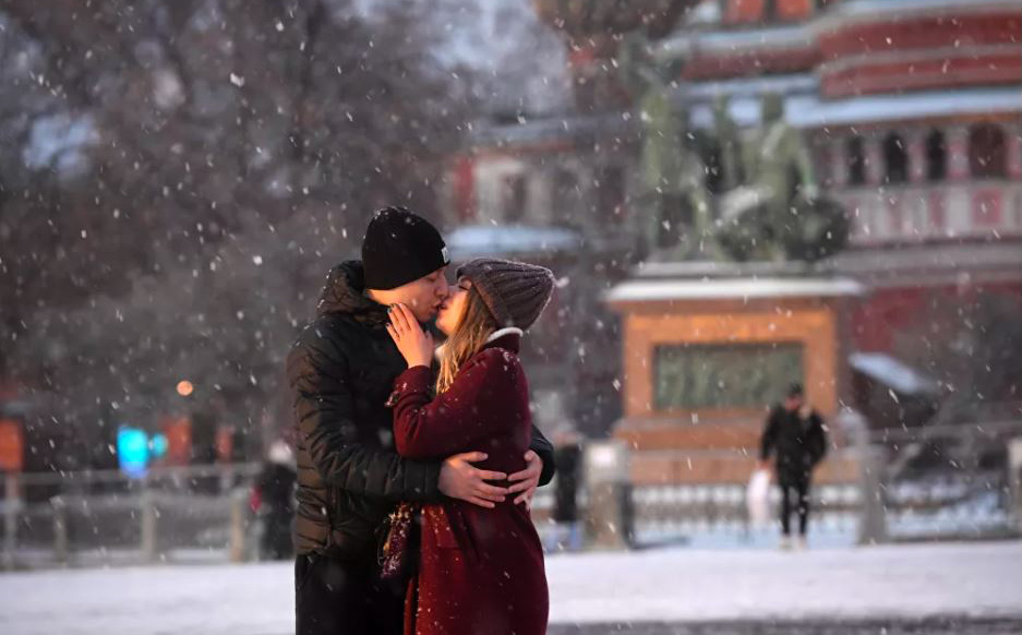 Cặp đôi hôn nhau dưới mưa tuyết trên quảng trường Đỏ ở thành phố Moscow, Nga. Ảnh: Sputnik