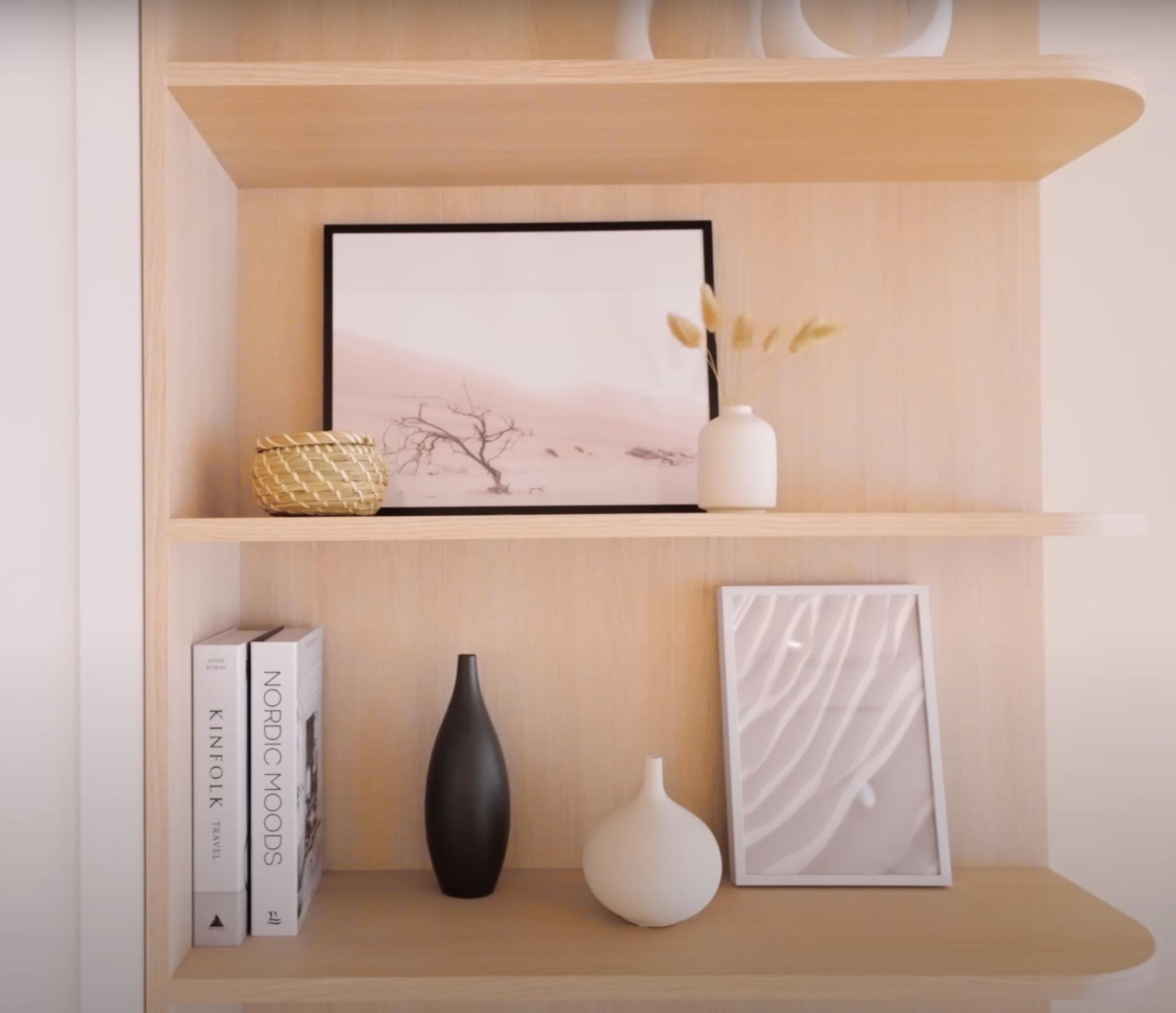 Ở lối vào bố trí chiếc tủ đứng màu trắng, có kệ mở. Tủ làm từ gỗ có tông màu sáng, đồng thời làm cạnh cong mềm mại để đảm bảo an toàn cho trẻ nhỏ