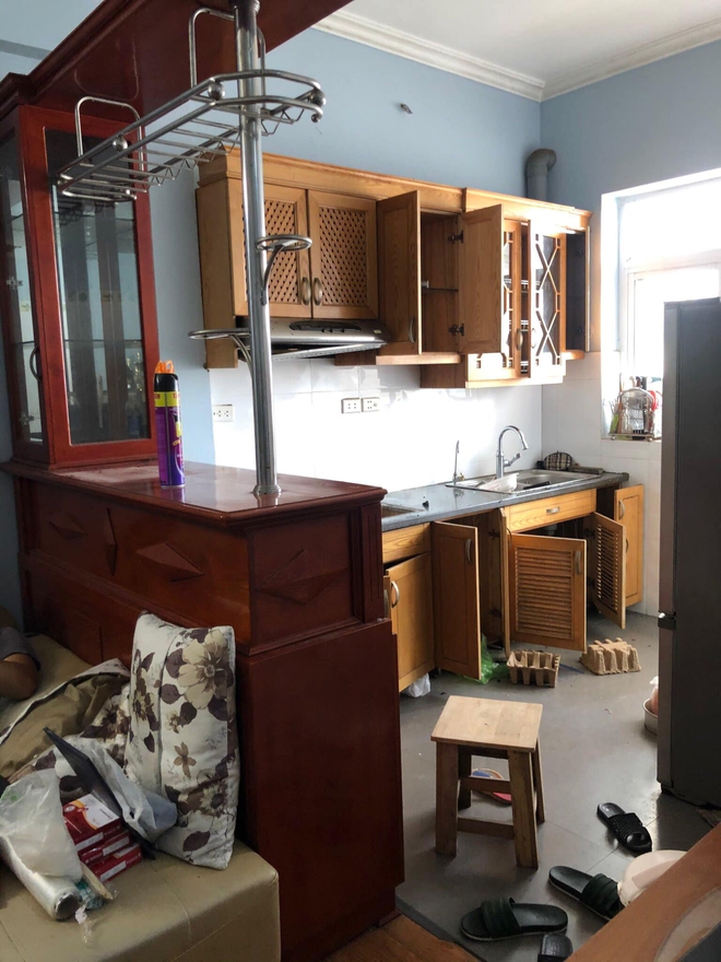 Thực trạng căn hộ trước cải tạo vô cùng bí bách, chật chội. Phòng khách không có cửa sổ và bị chắn bởi quầy bar bếp, không có ánh sáng tự nhiên. Cùng với đó là nội thất cũ kĩ, lỗi thời và hỏng hóc rất nhiều. Sau khi bàn bạc với chủ nhà, KTS quyết định giữ lại phần thô của căn hộ, đồng thời đập bỏ bức tường ngăn giữa phòng khách và phòng ngủ đầu tiên để thiết kế thành phòng đa năng. Đây vốn là phòng ngủ được KTS khéo léo thiết kế lại thành phòng đa năng, là nơi sinh hoạt chung của cả gia đình.
