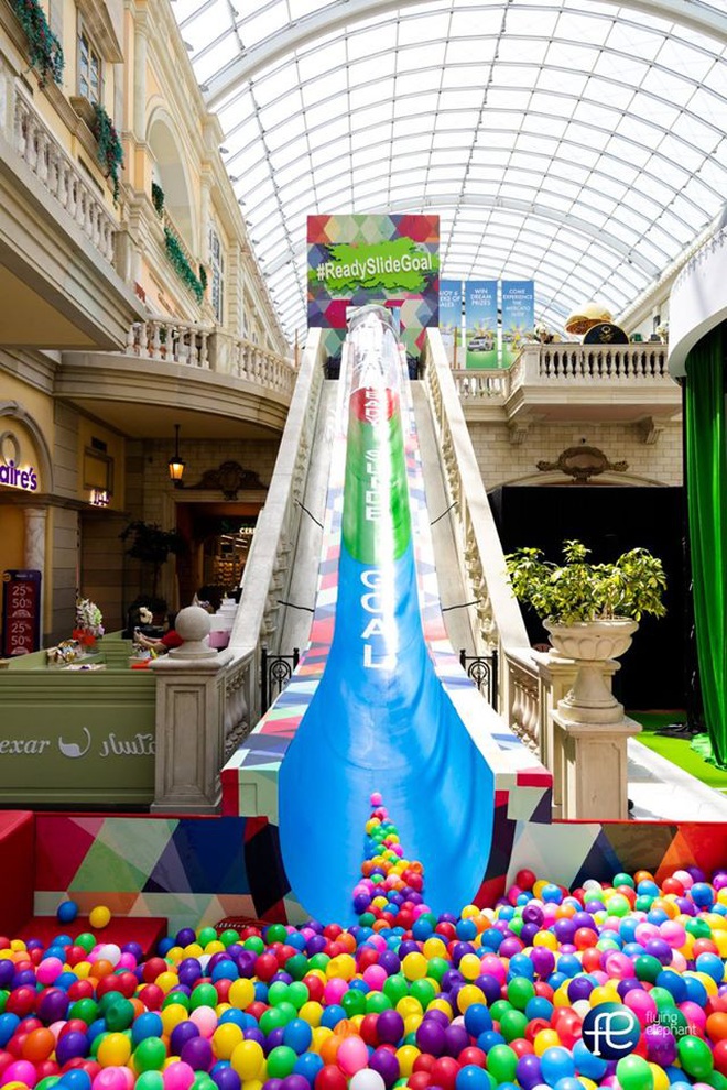 Đặc biệt, bước vào bên trong sảnh chính khu TTTM đình đám này, bạn sẽ bắt gặp ngay chiếc cầu trượt dẫn thẳng xuống nhà banh vô cùng dễ thương có tên là #ReadySlideGoal. Thay vì sử dụng thang cuốn bình thường và nhàm chán, La Isla đã có ý tưởng vô cùng táo bạo này khi thay đổi hẳn một bên cầu thang thành cầu trượt cho khách tha hồ tìm về tuổi thơ. Những vị khách đến đây cũng bày tỏ sự phấn khích lớn với thiết kế ngộ nghĩnh này.