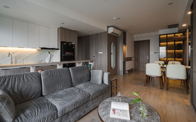 Không gian phòng khách là nơi dành được sự ưu ái nhiều nhất. Căn phòng đủ rộng và nhiều ánh sáng từ khung cửa lớn sát đất vì theo lời chàng trai là "làm việc căng thẳng thỉnh thoảng muốn ngắm nhìn thành phố để chill một chút".