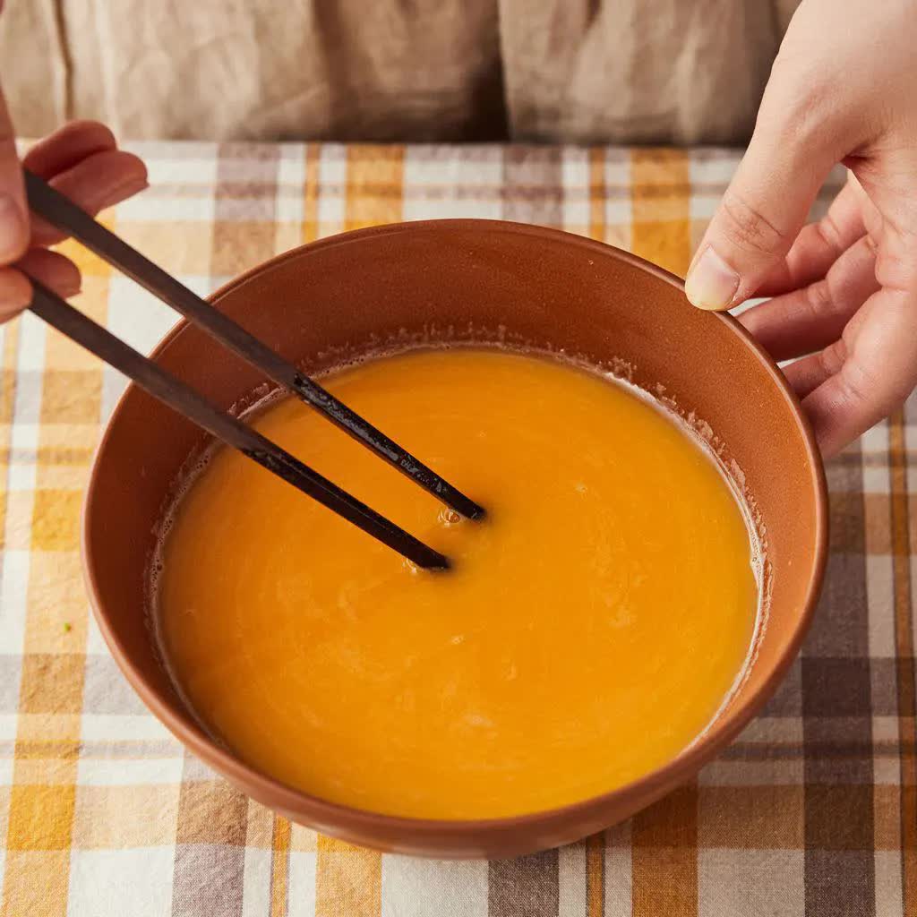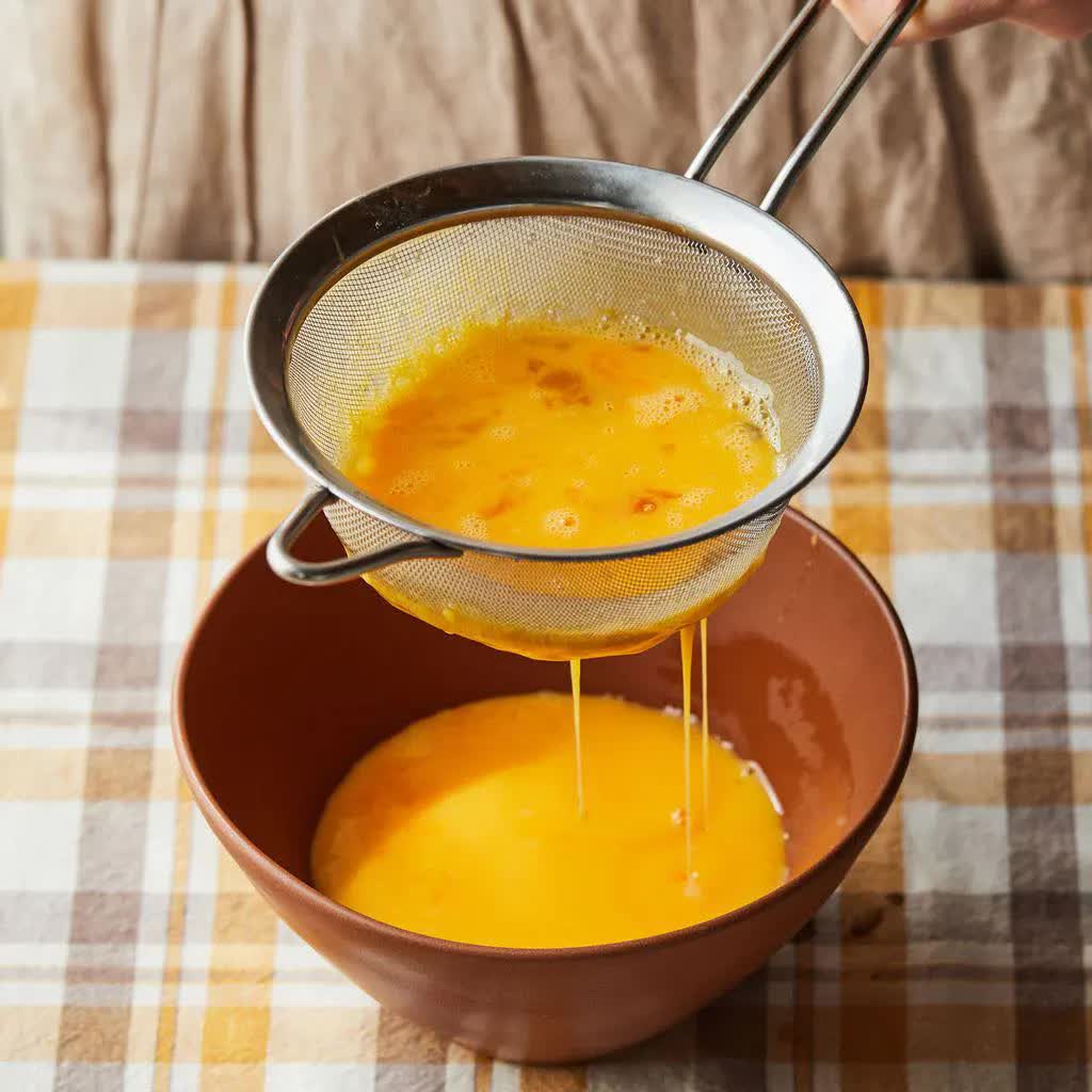 Bước 1: Đập trứng vào một bát tô sau đó đánh đều trứng. Tiếp theo, rây trứng qua rây cho mịn. Sau đó bạn cho nước dùng, rượu nấu ăn, gia vị, nước mắm vào khuấy đều.