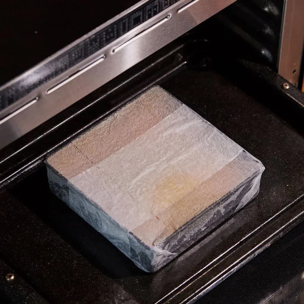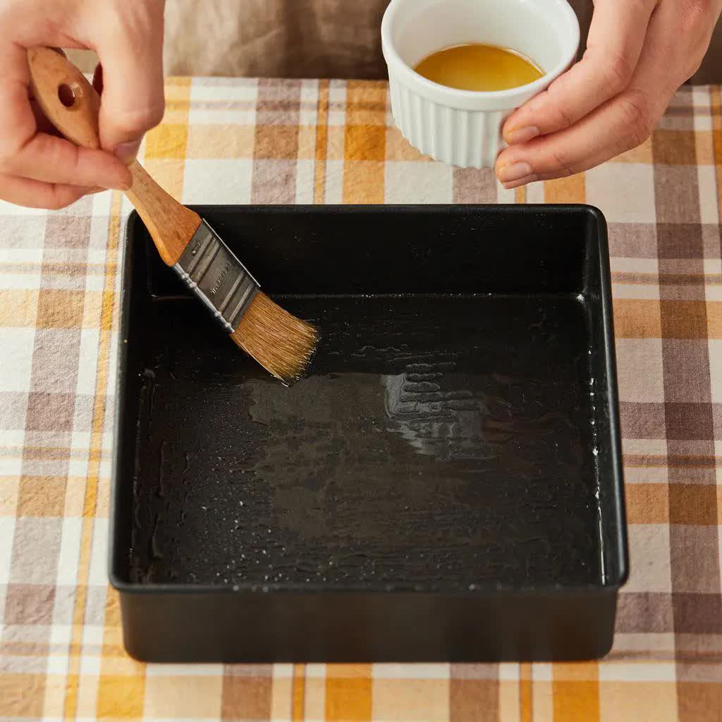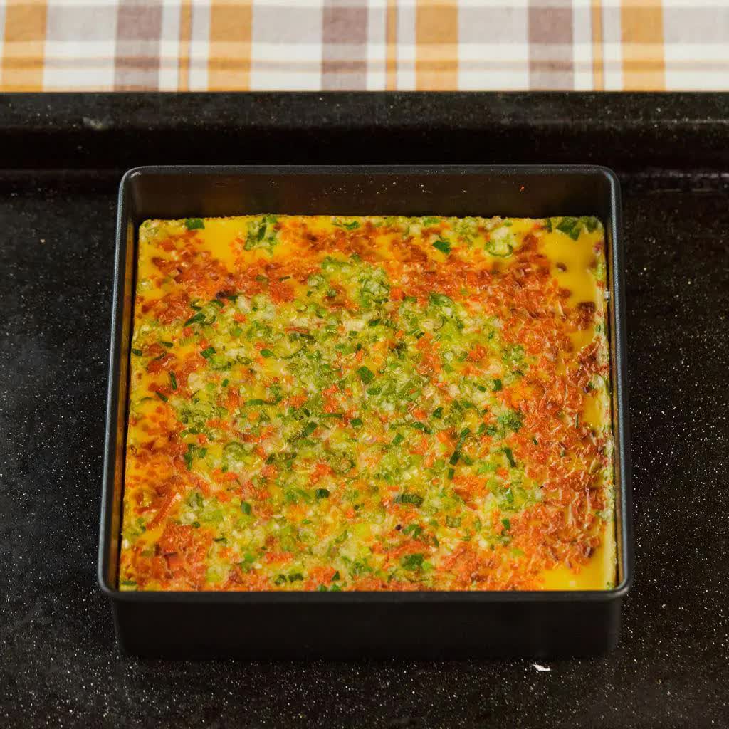 Mẹo nhỏ: Việc bạn dùng giấy bạc hoặc giấy nến phủ lên bề mặt khay sẽ giúp quá trình hấp trứng cách thủy trong lò nướng không bị nổi bọt khí trên bề mặt. Bạn có thể dùng khay nướng vuông kích thước 16cm. Như vậy thành phẩm sẽ vừa đủ độ dày tránh việc trong lúc nướng trứng tràn ra ngoài, sau khi hoàn thành miếng trứng cắt ra cũng vuông vắn, đẹp.
