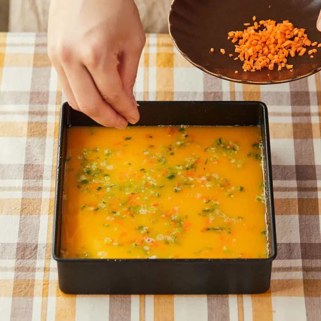 Bước 2: Dùng cọ phết dầu mè lên khắp lòng khay chịu nhiệt. Sau đó bạn cho phần trứng đã đánh đều vào. Ở bước này bạn có thể lọc qua rây 1 lần nữa để trứng được mịn mượt hơn. Kế tiếp bạn nhẹ nhàng rắc cà rốt xắt nhỏ và hành lá lên trên bề mặt. Sau cùng thì bạn dùng giấy bạc bọc lên mặt khay.