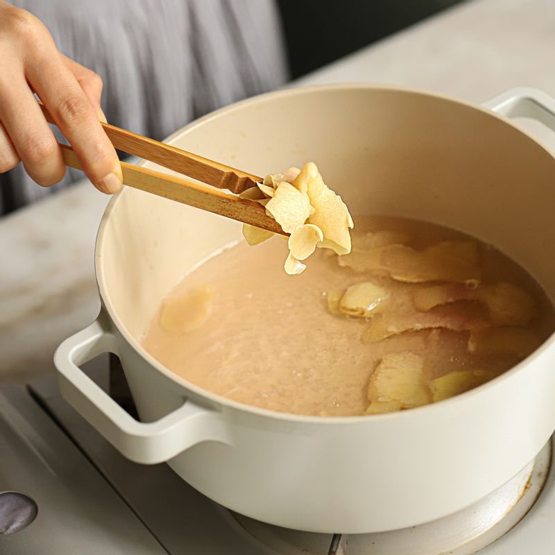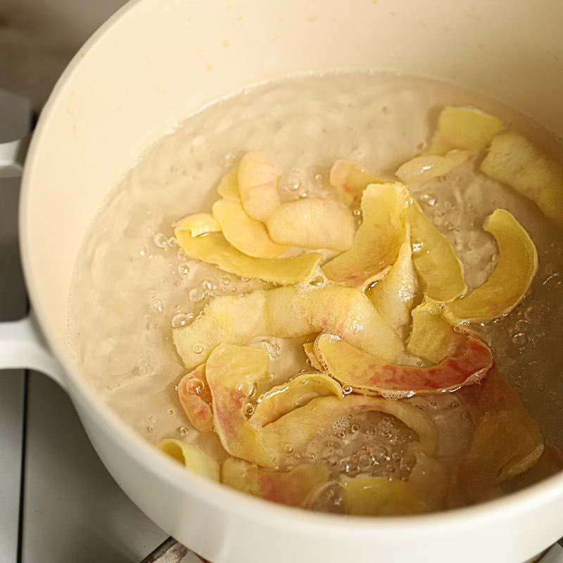 Bước 3: Cho nước và vỏ đào vào nồi đun sôi đến khi nước chuyển sang màu hồng từ vỏ đào thôi ra thì vớt bỏ vỏ ra. Cho thêm đường vào rồi tiếp tục đun sôi.
