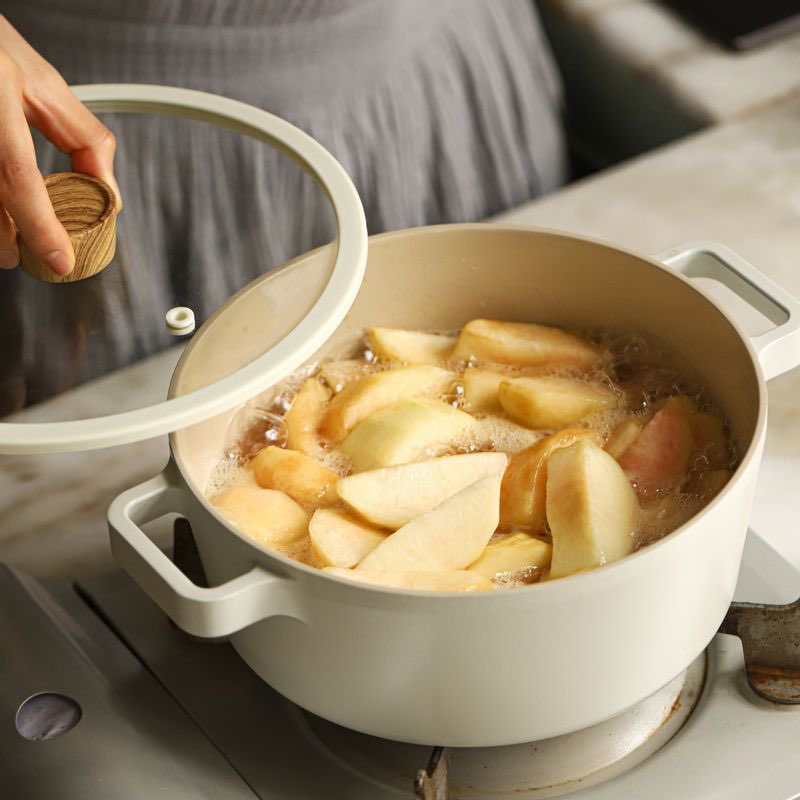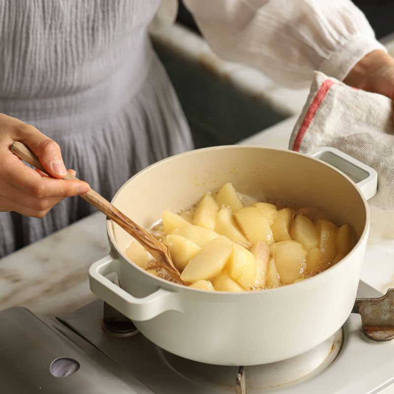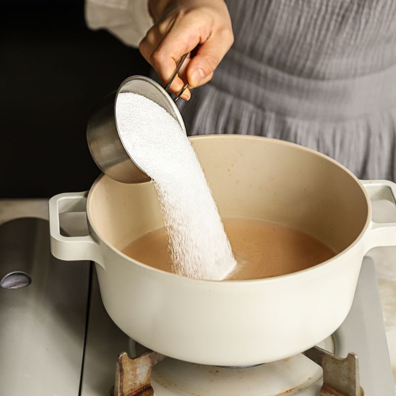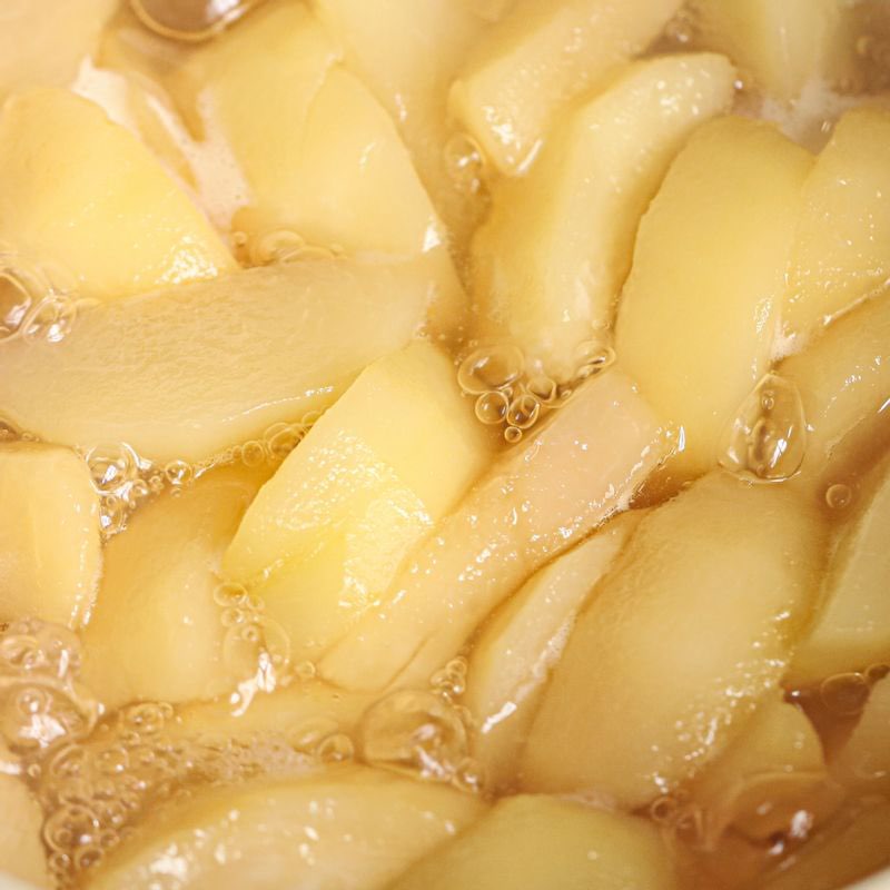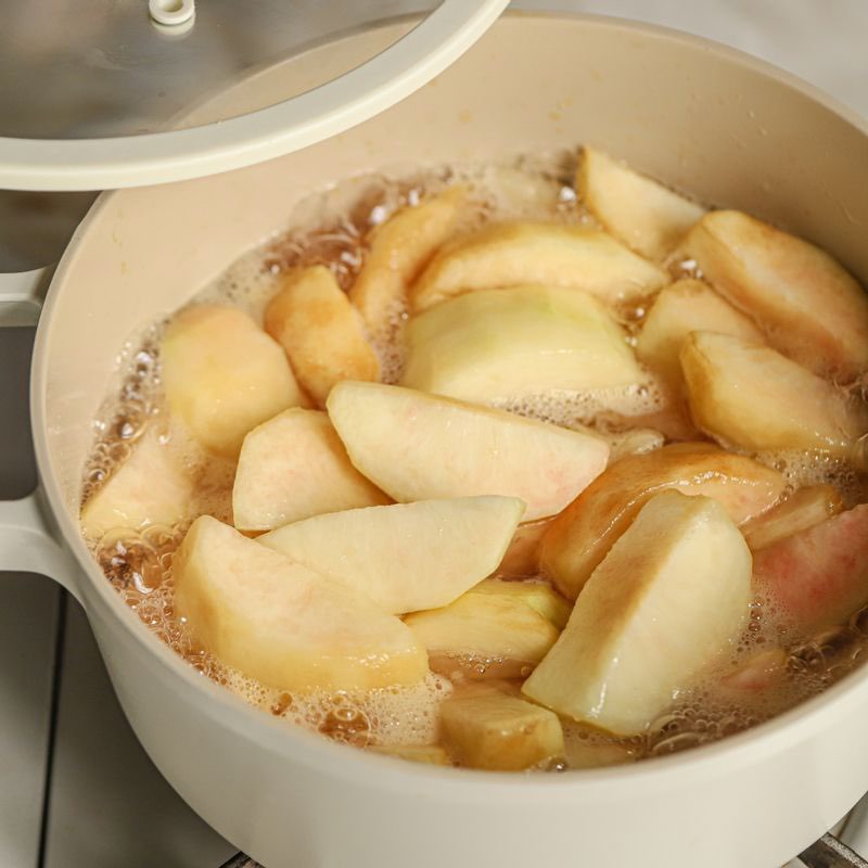 Bước 4: Khi đường tan chảy hoàn toàn vào nước thì cho đào vào rồi đậy nắp và đun ở mức lửa vừa trong 10 đến 15 phút.