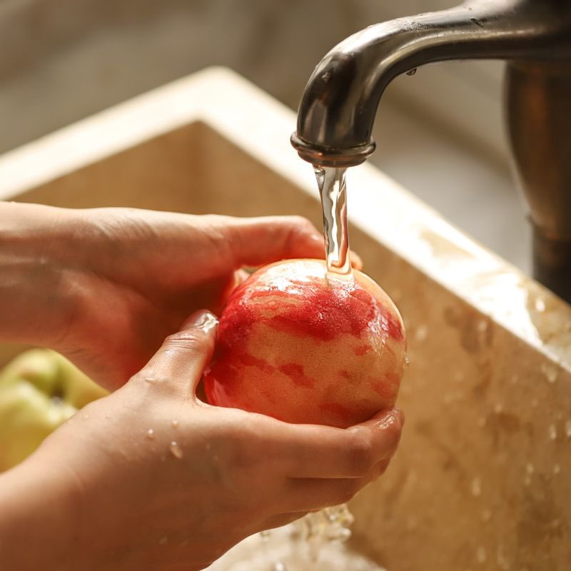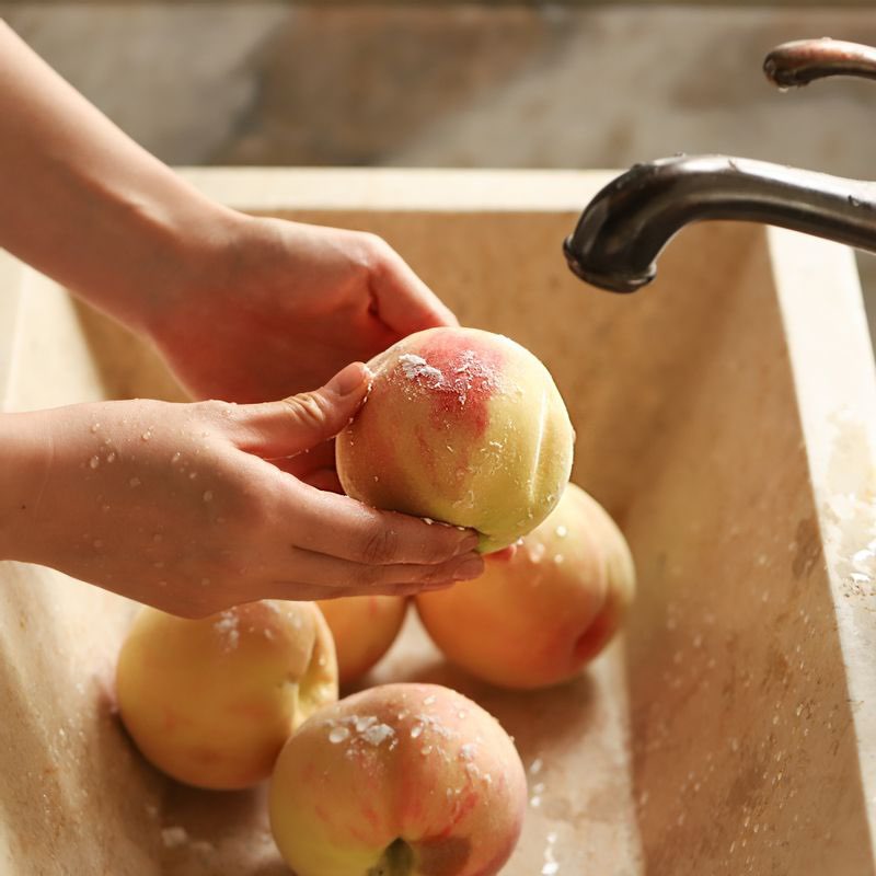 Bước 1: Đào mua về bạn dùng baking soda xoa khắp quả đào sau đó chà nhẹ. Đây là cách giúp bạn rửa sạch bụi bẩn cũng như loại bỏ lớp lông trên quả đào. Sau đó bạn rửa thật kỹ dưới vòi nước chảy.