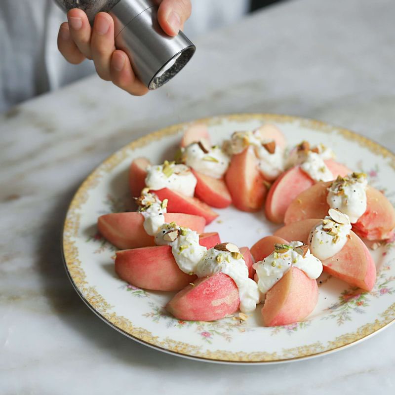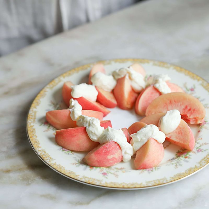 Bước 3: Xếp đào lên đĩa và cho 1/2 thìa canh phô mai ricotta (hoặc phô mai mascarpone) lên trên từng miếng đào.
