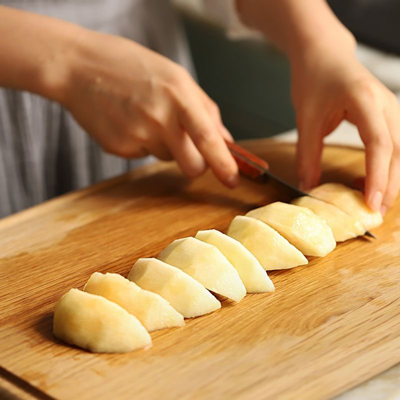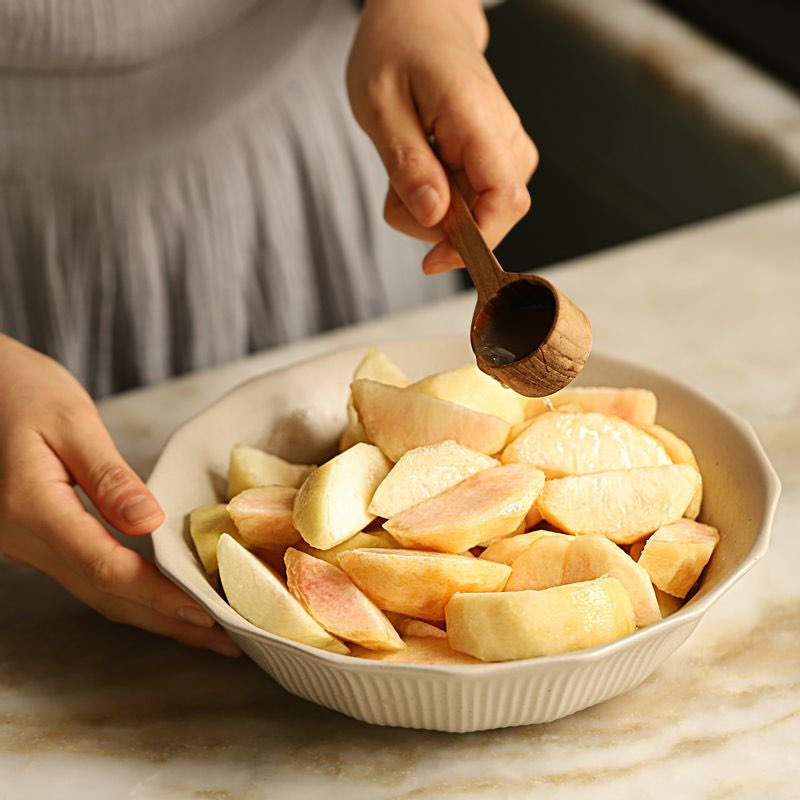 Bước 1: Rửa đào thật sạch, gọt vỏ và cắt thành miếng hình miếng cau.