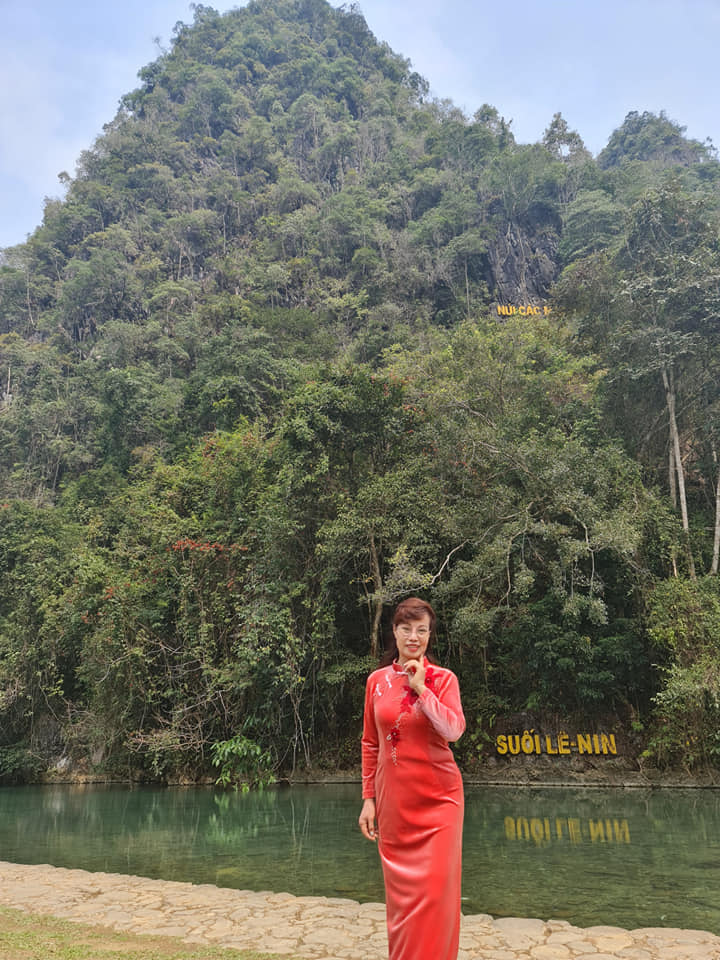 Nhân ngày 8/3 vừa qua, Thu Sao cũng khiến nhiều chị em ghen tị khi khoe ảnh được chồng "phi công" đưa đi du lịch. Tuy chỉ là thưởng ngoạn cảnh đẹp núi rừng ngay ở quê hương Cao Bằng, song Thu Sao cũng diện áo dài nhung đỏ khá lịch sự, tạo dáng đủ kiểu để chồng chụp hình.