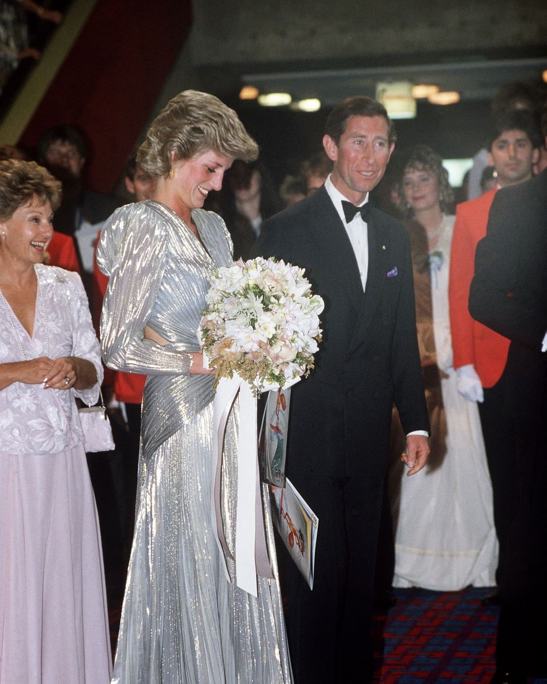 Trong chuyến công du của Hoàng gia tới Úc và New Zealand, Công nương Diana đã diện bộ đầm hồng ngọt ngào của Victor Edelstein với vương miện của gia đình Spencer. Bộ đầm kết hợp với trang sức lục bảo và vương miện cao quý càng lộng lẫy hơn bao giờ hết. Nhưng ít ai biết bà phá lệ Hoàng gia khi không đeo găng tay, chỉ để có những giây phút giao lưu thoải mái và chân thành nhất với tất cả mọi người.