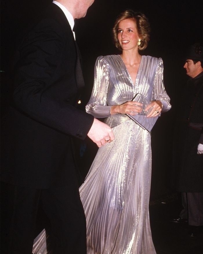 Công nương Diana chọn một bộ đầm ánh kim lấp lánh để xuất hiện tại thảm đỏ lễ ra mắt phim "The James Bond A View to a Kill" vào năm 1985. Công nương quá cố khiến công chúng phải choáng ngợp trước vẻ đẹp kiêu sa, lộng lẫy đúng chuẩn Hoàng gia của mình.