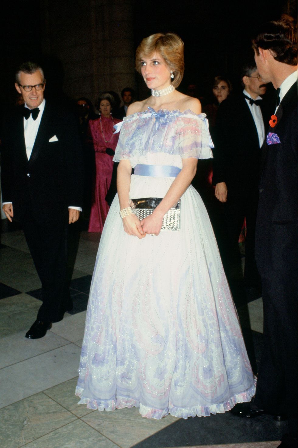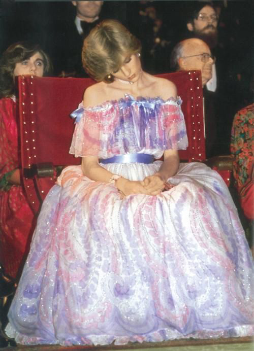 Xuất hiện trong sự kiện được tổ chức tại Bảo tàng Victoria và Albert, Công nương Diana diện một thiết kế đầm trễ vai bồng bềnh như mây, bộ đầm quá đỗi hoàn hảo để tôn lên nhan sắc mỹ miều của bà. Đặc biệt hơn cả, thời điểm này bà đang mang thai con đầu lòng được 2 tháng. Chính bởi giây phút Công nương Diana ngủ giật mà công chúng càng thêm nhớ về bộ đầm dạ hội đẹp đến xao xuyến lòng người này.