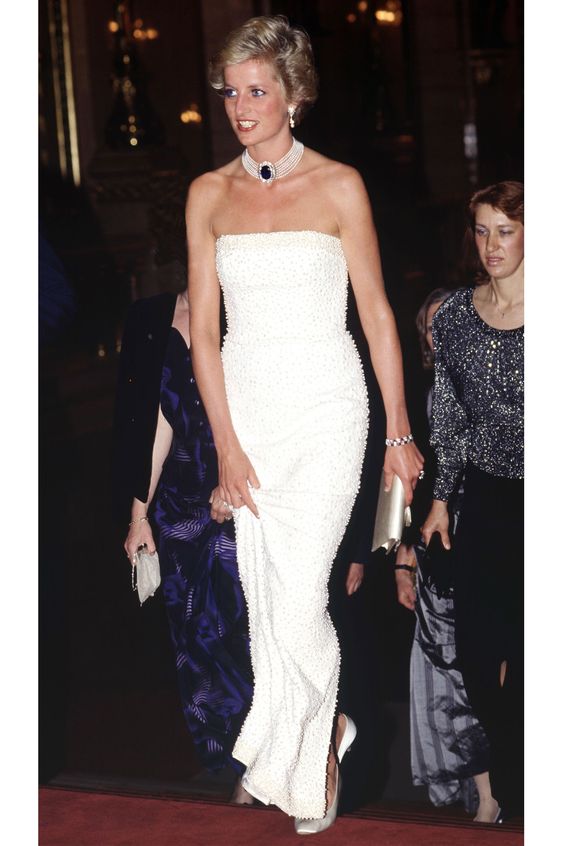 Thiết kế đầm cúp ngực ngọc trai với sắc trắng trang nhã sang trọng được Công nương Diana diện theo hai phiên bản đối lập nhau: Một sexy tột cùng, một kín đáo thanh tao chuẩn chỉnh phong cách Hoàng gia. Ngay cả đến trang sức đi cùng cũng được Công nương quá cố lựa chọn phù hợp với mỗi một style bà diện.