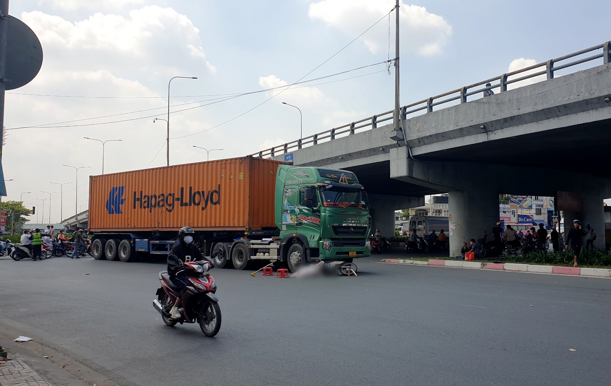 Tại hiện trường, xe máy và người nằm dưới bánh xe phía trước, bên phải cabin.