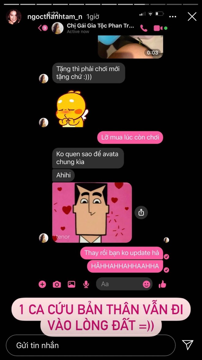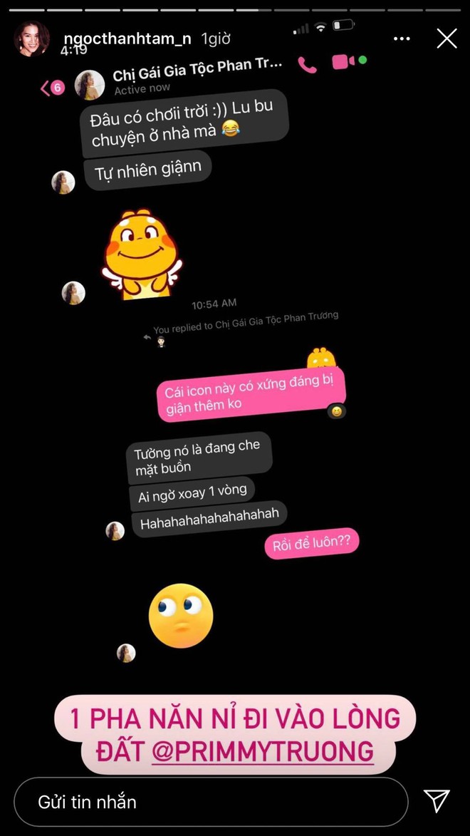 Mới đây, Ngọc Thanh Tâm đã chứng minh tình bạn của mình với vợ sắp cưới thiếu gia Phan Thành khi đăng ảnh đoạn chat của cả 2 lên story. Nội dung chỉ đơn giản cô nàng đang năn nỉ vì bị Primmy Trương dỗi nhưng bất thành.