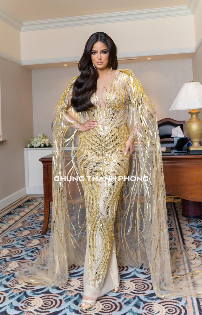 Trong đêm chung kết, Harnaaz Sandhu chọn diện mẫu thiết kế tinh tế với những đường thêu tay như sợi vàng mềm mại chảy dọc thân hình, tạo nên vẻ đẹp quyền lực tối thượng của NTK Chung Thanh Phong