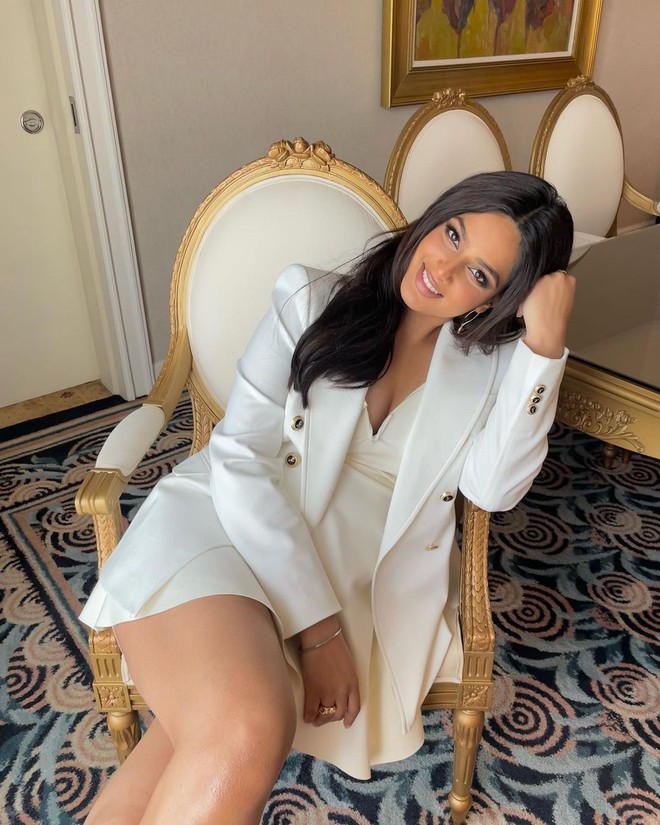 Rút kinh nghiệm từ ngày hôm trước, Hoa hậu Ấn Độ chọn diện váy cúp ngực phối blazer rộng rãi khi tham dự sự kiện sau đó. Sắc trắng của trang phục làm gia tăng vẻ quyền quý của Hoa hậu, đồng thời trang phục phù hợp che đi những yếu điểm hình thể vốn có