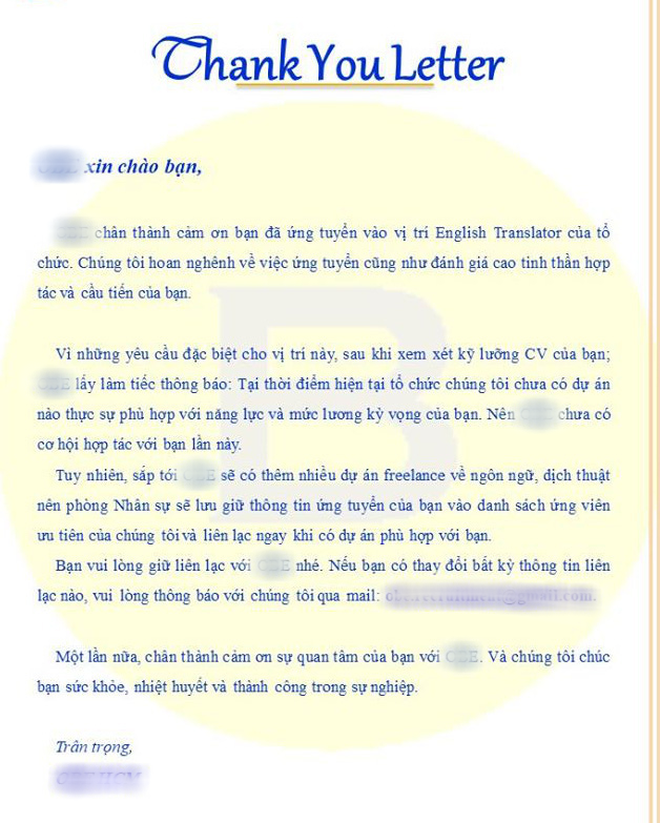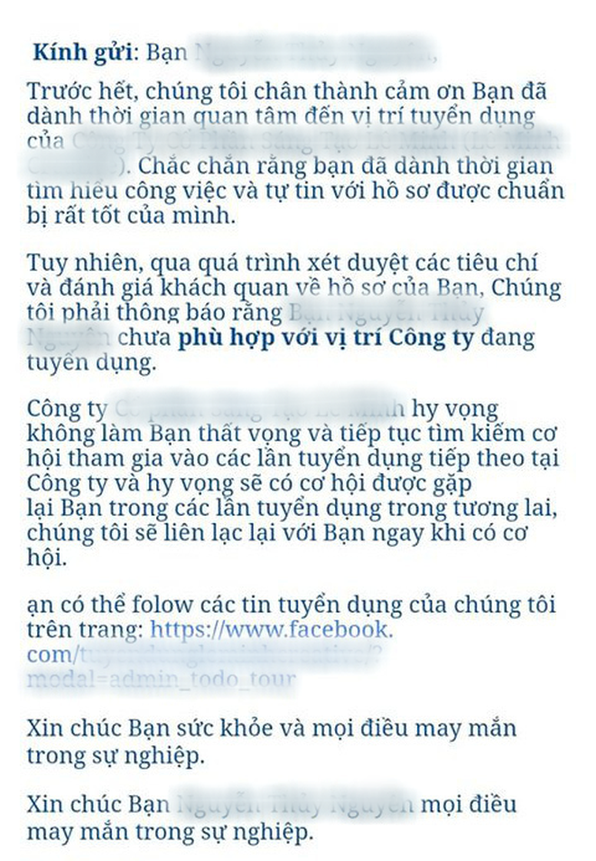 "Bạn nên nói cho ứng viên biết bạn ấy chưa phù hợp với công ty ở điểm nào? Hay trong quá trình phỏng vấn bạn ấy cần phải cải thiện ở đâu thì hợp lý hơn thư từ chối kiểu này", bạn T.H chia sẻ.
