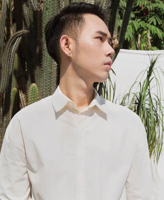 Đây có lẽ là người "màu sắc" và diện nhất buổi phỏng vấn. Đối lập với phong thái trả lời nhẹ nhàng, hơi bẽn lẽn trong video, Chí Cường lại cho thấy mình rất có gout ăn mặc và phối đồ. Cậu bạn mix áo sơ mi mang vibe nhiệt đới với áo len da beo lông xù theo style áo trong áo ngoài, quần da ống hơi loe, platform boot và mũ beanie đen để cân bằng lại hai item nổi bật kia