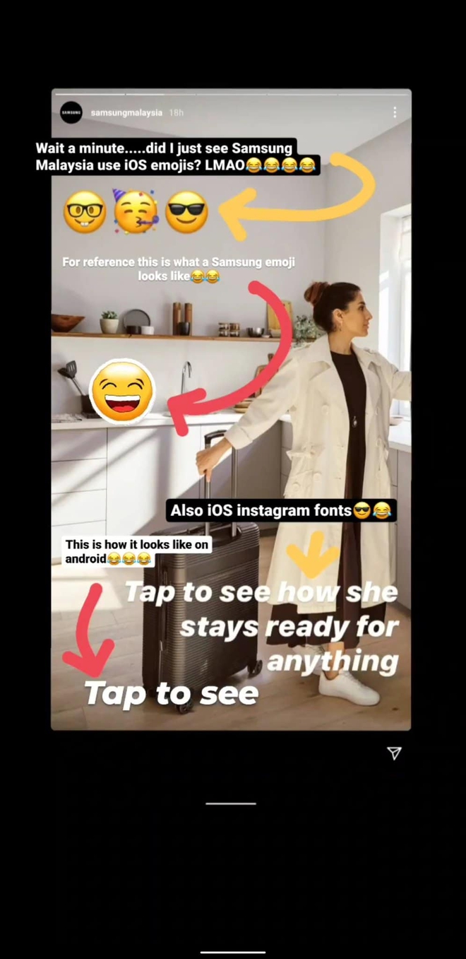 Mới đây, trong một group công nghệ đã chia sẻ hình ảnh việc Instagram của nhãn hàng Samsung tại Malaysia đăng hình ảnh quảng cáo lên story nhưng điều đáng chú ý là icon và font chữ trong ảnh lại của iPhone.