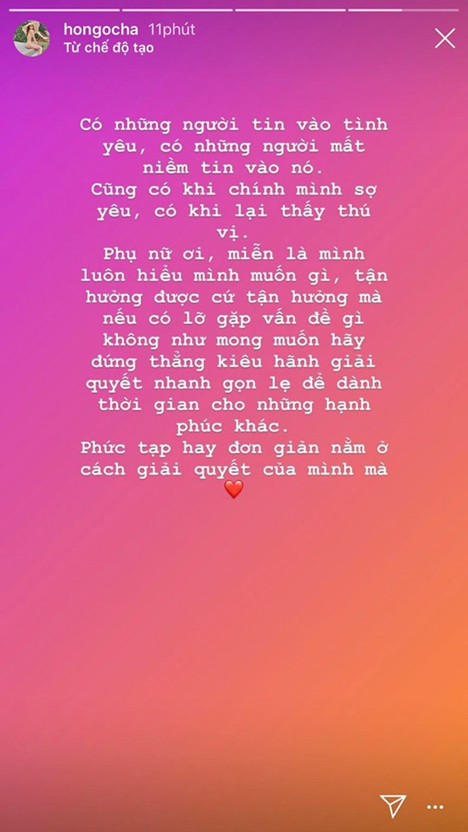 Ngay sau màn thể hiện tình cảm của Kim Lý, Hà Hồ cũng hạnh phúc đáp lại: "3 năm. Thấy nhanh chứ chẳng dài vì mình vui nên cái gì thấy nó cũng nhanh. 1 tháng mà buồn cũng là dài. Nhưng dài ngắn nó không còn là thước đo của hạnh phúc nữa. Mọi thứ vốn dĩ mong manh. Nếu là những kẻ có ý thức với cuộc sống và tương lai của mình ắt sẽ tự bản năng dẫn lối đi đúng hướng. Mình cũng chẳng cần ngôn tình hay nói quá nhiều về tình yêu. Vì vốn dĩ hạnh phúc và đau khổ đều được thể hiện qua ánh mắt. Cảm ơn anh".