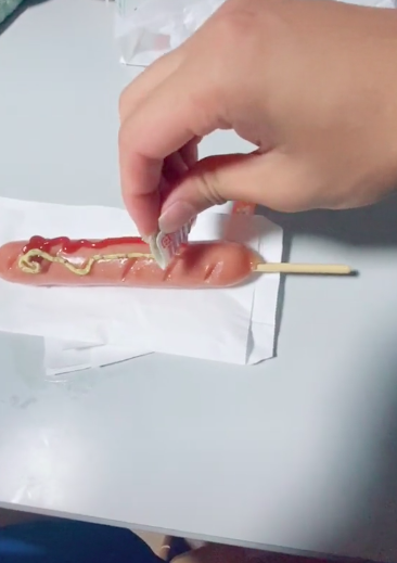 Chỉ cần bẻ gập đoạn giữa của vỉ sốt gia vị lại rồi trải đều lên cây xúc xích là ăn quá ngon lảnh rồi nè!