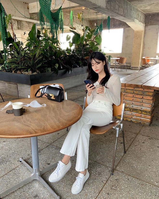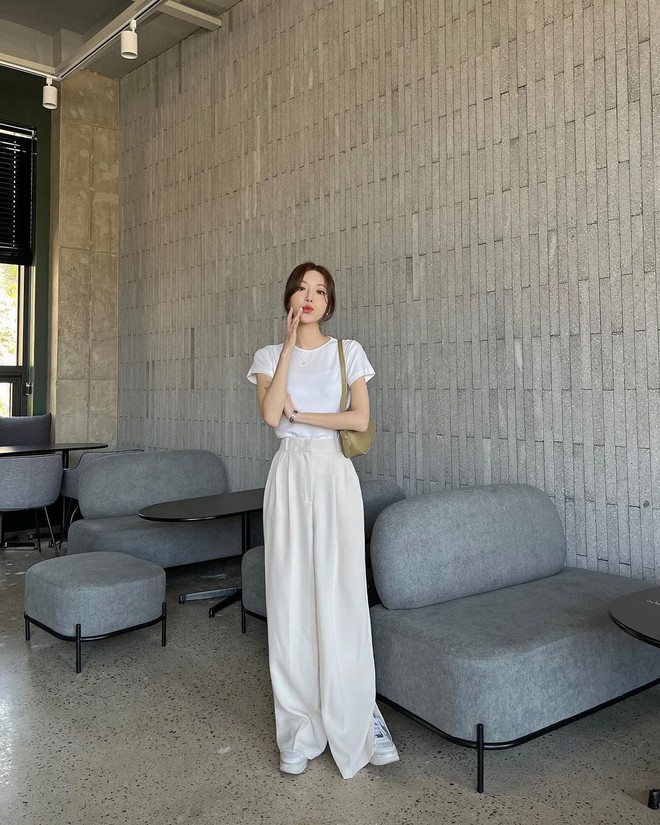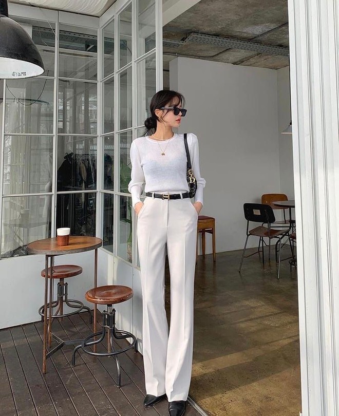 Bí quyết đầu tiên để mặc đẹp hơn với chiếc quần trắng chính là phối thêm một chiếc áo trắng tinh khiết để làm tăng vẻ sáng sủa và sạch sẽ hơn cho bộ trang phục của bạn. Sự kết hợp giữa trắng và trắng đang là xu hướng thời trang được nhiều chị em ưa chuộng. Màu trắng sẽ giúp da của bạn sáng và trắng hơn, ngoài ra còn giúp bạn dễ tạo thiện cảm với người đối diện ngay từ lần gặp đầu tiên. Với sự kết hợp này, bạn cũng có thể tạo thêm điểm nhấn cho outfit của mình với các món phụ kiện khác màu như thắt lưng, túi xách, vòng cổ, giày hoặc mắt kính,... Nói chung, trắng - trắng chính là công thức phối màu dễ dàng nhất mà bạn nên áp dụng ngay trong mùa hè này.