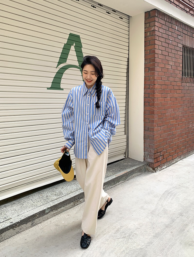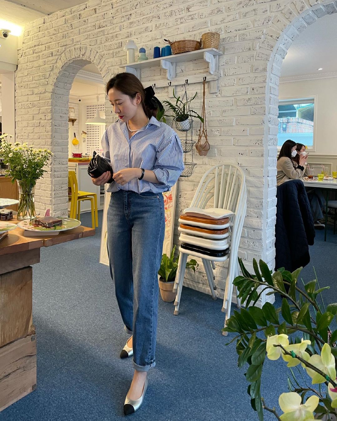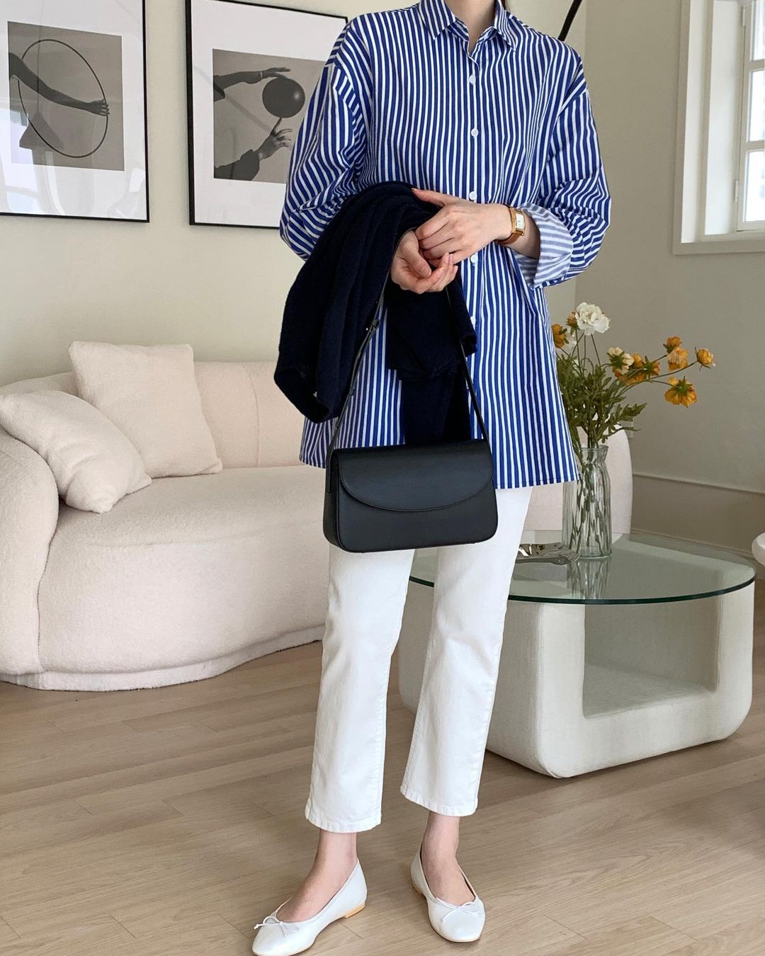 Ngoài cách diện áo sơ mi kẻ sọc hết sức quen thuộc là mix với quần jeans, quần âu đen hay chân váy, các quý cô sành điệu đang tích cực diện mẫu áo này cùng quần trắng. Sự kết hợp này hack tuổi cực kỳ hiệu nghiệm, đem đến vẻ tươi sáng cho cả tổng thể trang phục nhưng quan trọng không kém, bạn cũng dễ ghi điểm xịn mịn và thanh lịch với bộ đôi này. Để đặt một cái kết hoàn hảo cho set đồ, những mẫu giày trendy như: loafer, sneaker trắng, mule sẽ là lựa chọn lý tưởng.