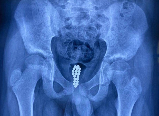 Qua hình ảnh chụp X-quang, các bác sĩ đã vô cùng sốc khi phát hiện có tới 20 quả bóng từ tính (còn gọi là Buckyball - bóng có nam châm) bị mắc kẹt bên trong dương vật của một cậu bé 11 tuổi. Theo chia sẻ thì cậu bé đã phải chịu đựng một loạt các triệu chứng sau khi nhét những quả bóng này vào dương vật, bao gồm cả biểu hiện có máu trong nước tiểu. Thế nhưng, trong suốt 1 tuần, vì quá sợ hãi mà cậu bé không dám nói với bố mẹ mình.