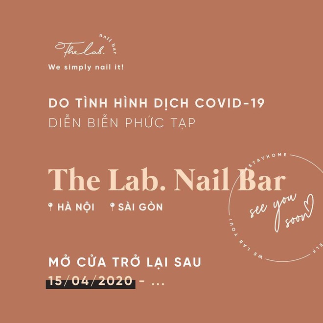 The Lab - Nail Bar cũng là một trong các địa chỉ làm móng quen thuộc của nhiều bạn trẻ Sài Gòn - Hà Nội. Tuy nhiên, do diễn biến phức tạp của dịch Covid-19, tiệm đã phải đóng cửa từ ngày 25/3 và dự kiến sẽ mở cửa trở lại sau ngày 15/4. Gần một tháng im lìm, đây chính là thời gian vất vả nhất của The Lab, thậm chí còn khiến tiệm lao đao hơn cả thời điểm mới khai trương.