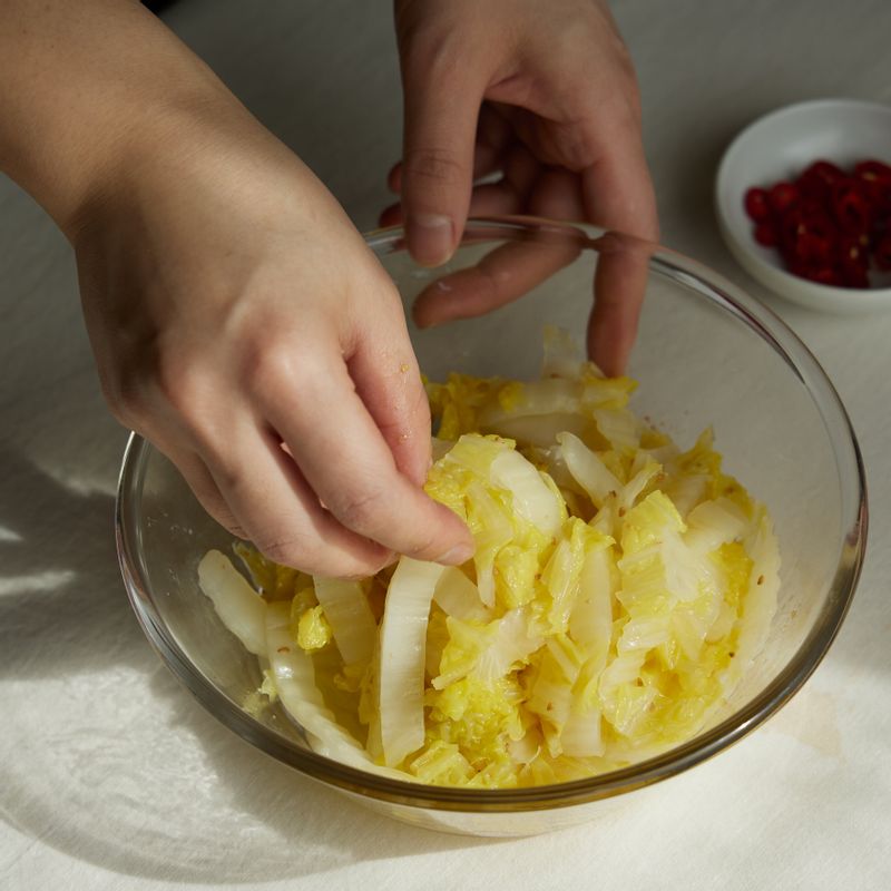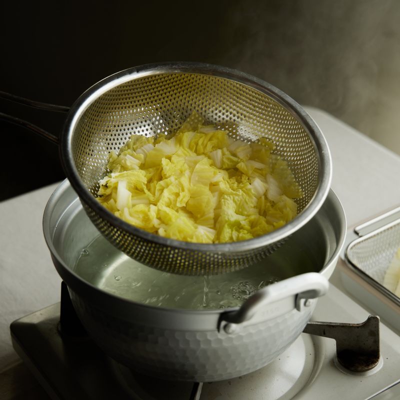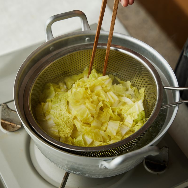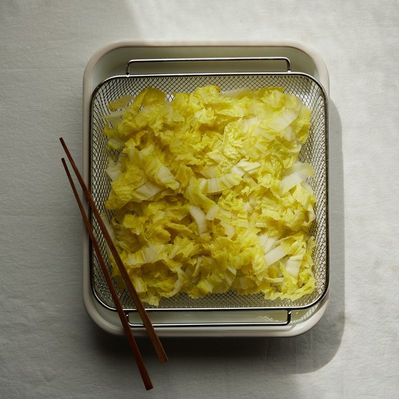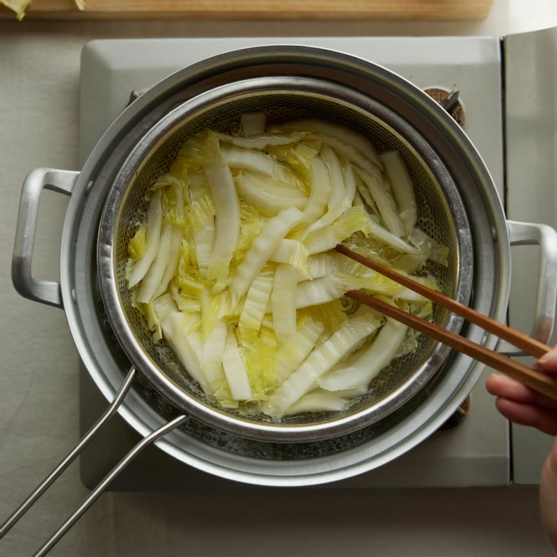 Bước 3: Sau khi chần trong cải thảo thì đổ ra lưới lọc, để nguội và ráo nước. Lưu ý: Bạn không cần ép vắt nước mà hãy để cải thảo thoát hơi ẩm và ráo tự nhiên.