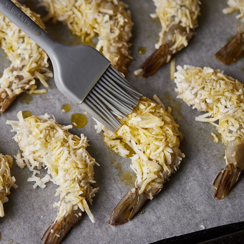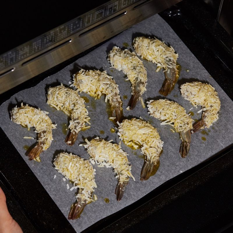 Bước 3: Bạn lấy khay của nồi chiên không dầu ra. Đặt lớp giấy nến (hoặc giấy bạc) lên khay rồi phết một lớp dầu mỏng. Tiếp theo bạn xếp tôm vào và phết dầu lên tôm. Cho khay vào nồi chiên và bật chế độ chiên với mức nhiệt 170 độ trong khoảng 10 phút. Khi được 2/3 khoảng thời gian thì bạn kéo khay chiên ra, lật mặt tôm và tiếp tục chiên cho đến khi tôm chín có màu vàng ruộm đẹp mắt.