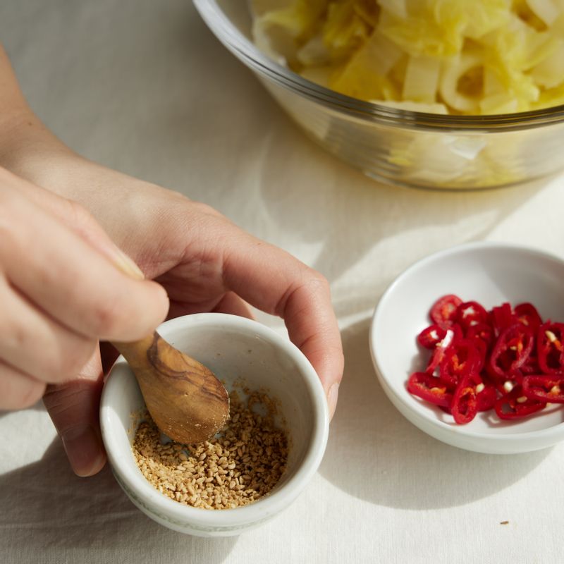 1 cây cải thảo vừa - 1 quả ớt đỏ - 2 muỗng canh hạt vừng rang.
