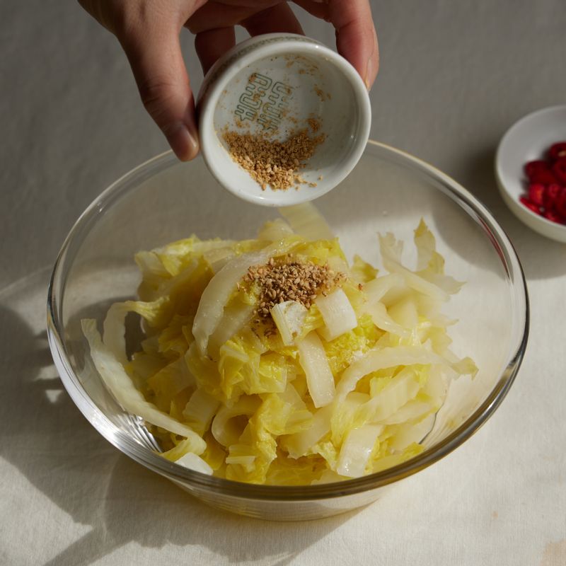 Cho cải thảo đã ráo nước vào tô. Tiếp theo cho dầu mè, hạt vừng rang và muối vào rồi trộn đều. Bạn để lại một chút vừng hạt để trang trí nhé. Sau khi trộn xong bạn cho cải thảo ra đĩa và rắc vừng hạt lên trên.