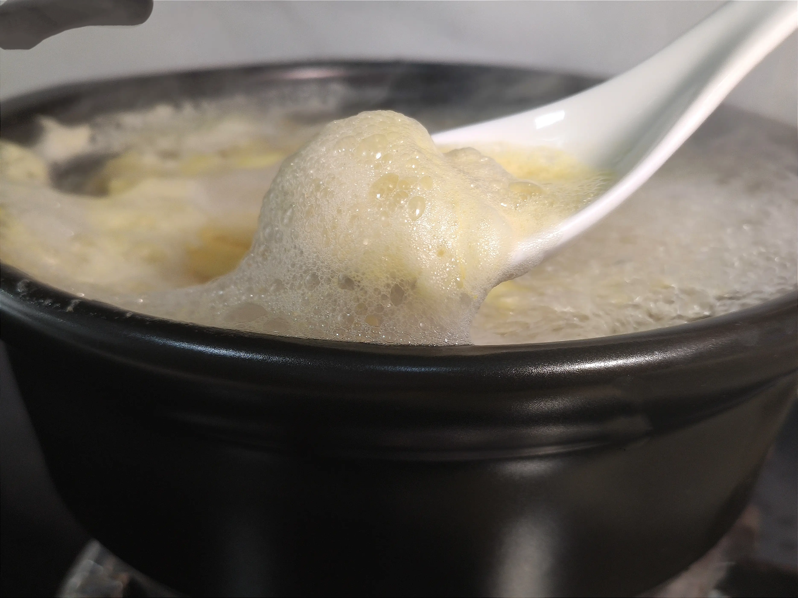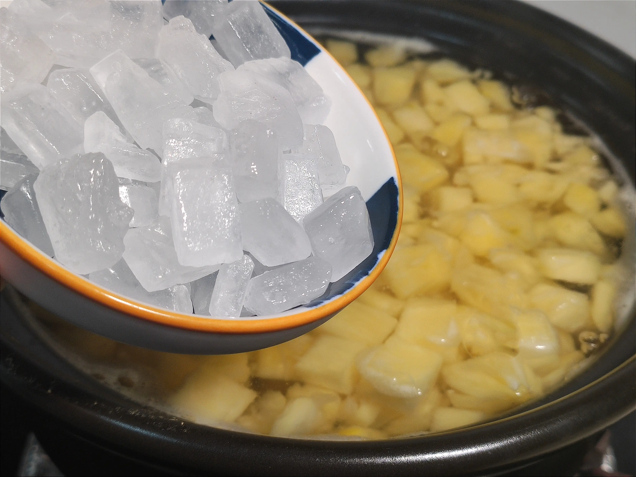 Bước 3: Sau đó, vặn lửa lớn và đun sôi. Dùng thìa hớt hết bọt nổi lên, rồi vặn nhỏ lửa đun tiếp trong vòng 15 phút. Cho đường phèn vào và nấu cho tan, khuấy đều vài lần là có thể thưởng thức.