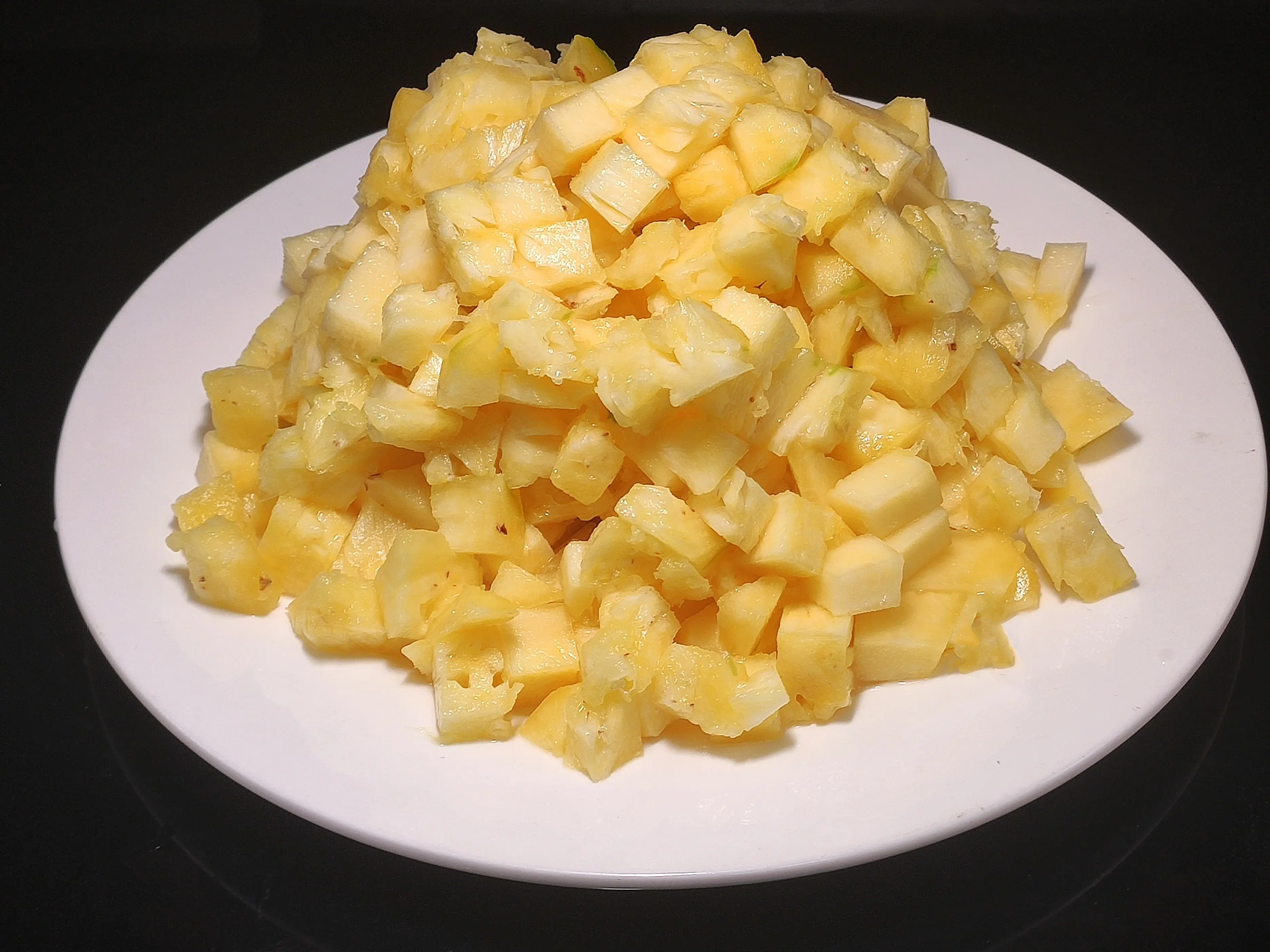 Bước 2: Bỏ phần cùi và cắt thịt dứa thành các miếng nhỏ, điều này giúp dứa chín nhanh hơn. Sau khi cắt nhỏ, cho dứa vào nồi, thêm 2,5 bát nước, ngập dứa là được.
