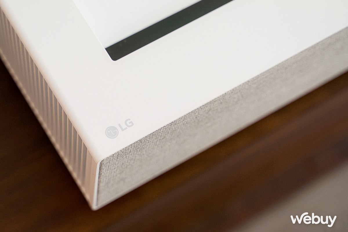 Đánh vào phân khúc cao cấp nên máy chiếu LG CineBeam HU715Q có vẻ ngoài đẹp mắt ấn tượng cũng là điều dễ hiểu. Nhìn thoáng qua nhiều người sẽ nghĩ đây là một chiếc đầu DVD hay máy chơi game. Lớp vỏ máy bằng nhựa nhám màu trắng muốt tinh khôi, kết hợp mặt trước phủ vải màu xám che đi hệ thống loa ngoài. Lớp vải này cũng không phải dạng vừa vì là vải dệt Kvadrat cao cấp đến từ Đan Mạch.