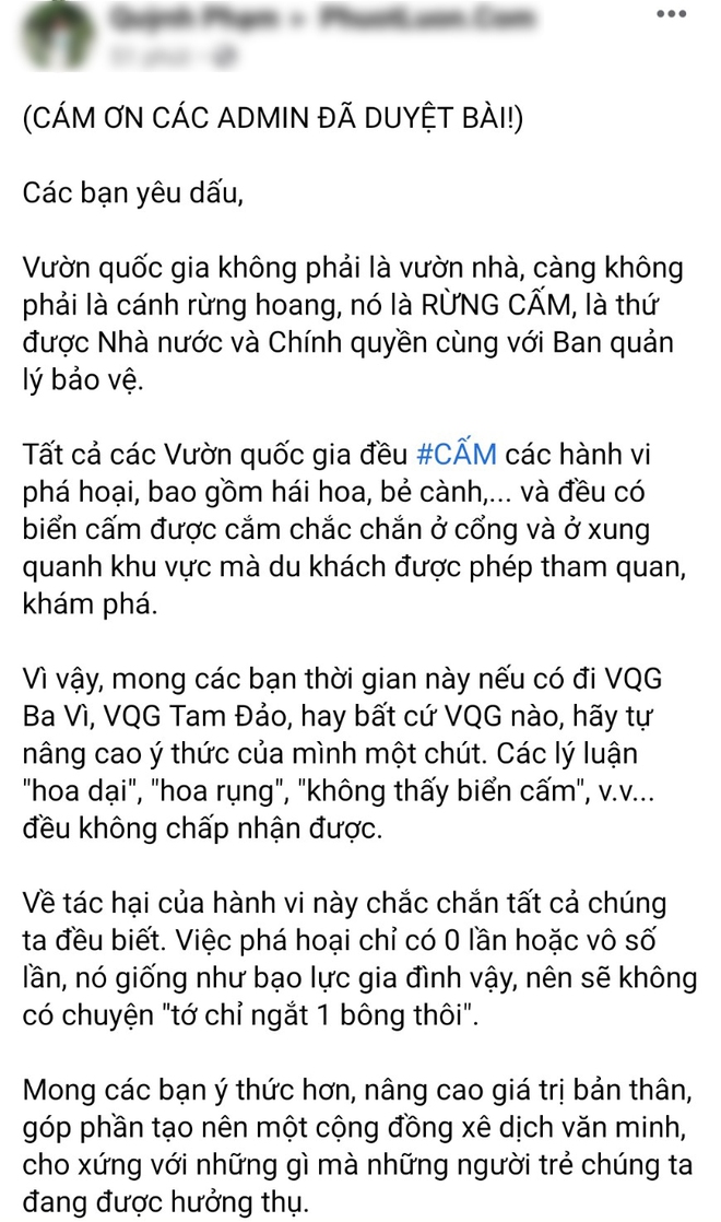 Theo những hình ảnh được đăng tải trong một nhóm về đi phượt, nhiều bạn đã ngắt hoa để chụp ảnh. Có người chỉ ngắt 1 bông, có người ngắt cả 1 bó. Đã có khá nhiều ý kiến phê bình và lên án hành động này. Thậm chí, có bạn còn đăng tải cả 1 bài viết để kêu gọi mọi người đừng bẻ cành, hái hoa khi đến các vườn quốc gia nữa. Đồng thời, chủ nhân bài viết cũng cung cấp thêm hình ảnh về tấm biển cấm hái hoa, bẻ cành và phá hỏng cảnh quan.