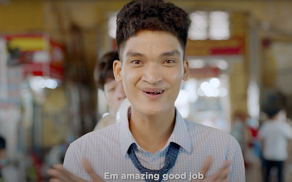 Cũng trong khu chợ, nhiều người mời gọi anh mua đồ nhưng anh liên tục lắc đầu từ chối, đến khi được ngỏ lời tặng quà (một trái bưởi) thì anh chàng mừng rỡ reo vang "Ơ mây zing gút chóp"!