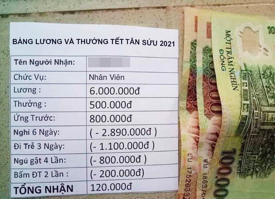 Đọc từng dòng tính tiền mà ai cũng không tin nổi vào mắt mình. Tổng lương trong ảnh chụp là 6 triệu đồng, thêm 500k tiền thưởng, nhưng sau khi trừ các khoản phạt như nghỉ không lương, đi trễ, ngủ gật, bấm điện thoại trong giờ làm thì con số thực tế nhận về là... 120 nghìn đồng! Tính ra cũng chỉ đủ chừng 3 bát phở, có khi ra chợ tiêu 1 lèo là hết nhẵn, thế thì chi tiêu Tết kiểu gì đây?!? Thật tội nghiệp chủ nhân bảng lương này, cầm 120k trong tay không biết có rớt nước mắt không đây?